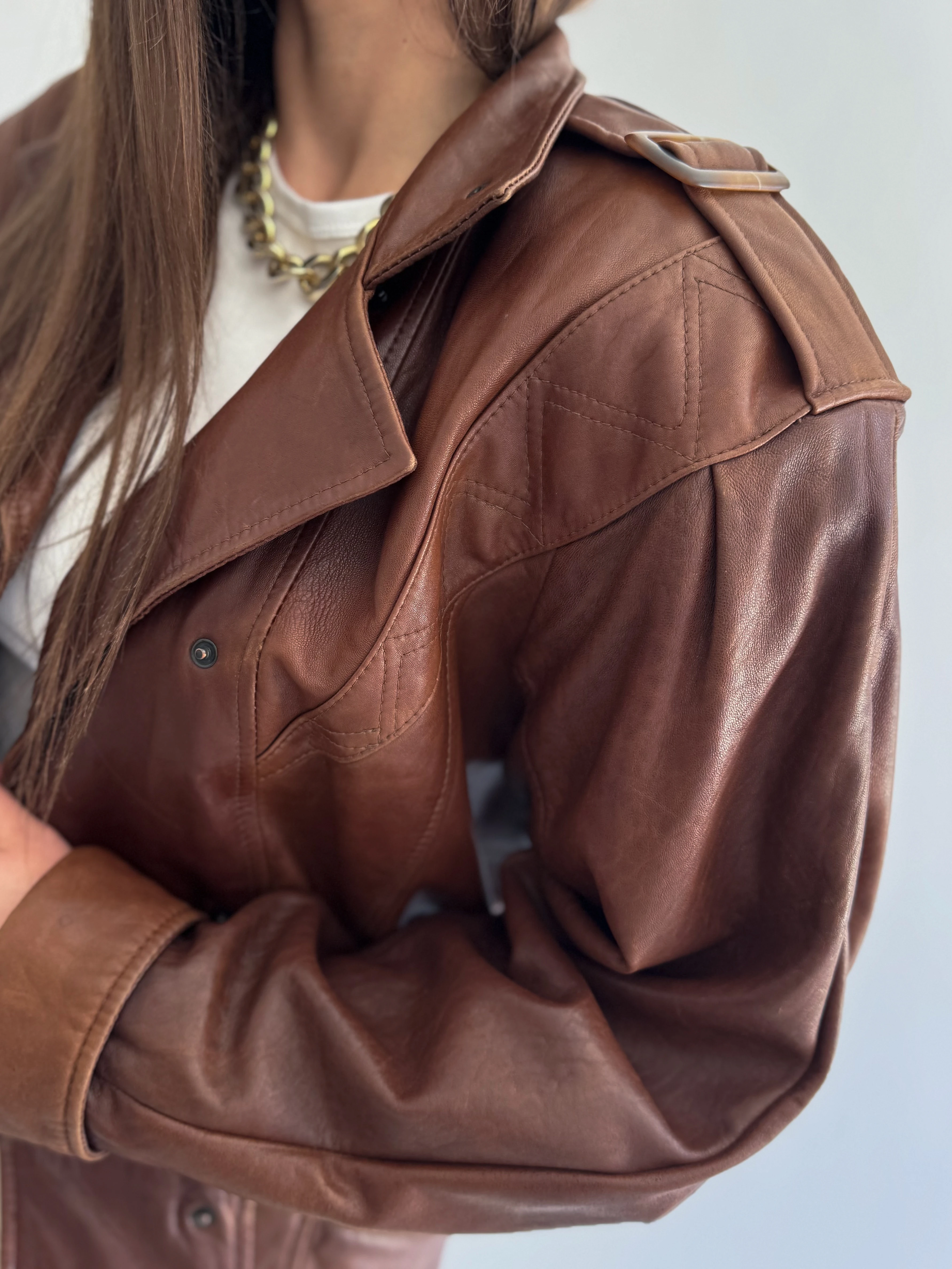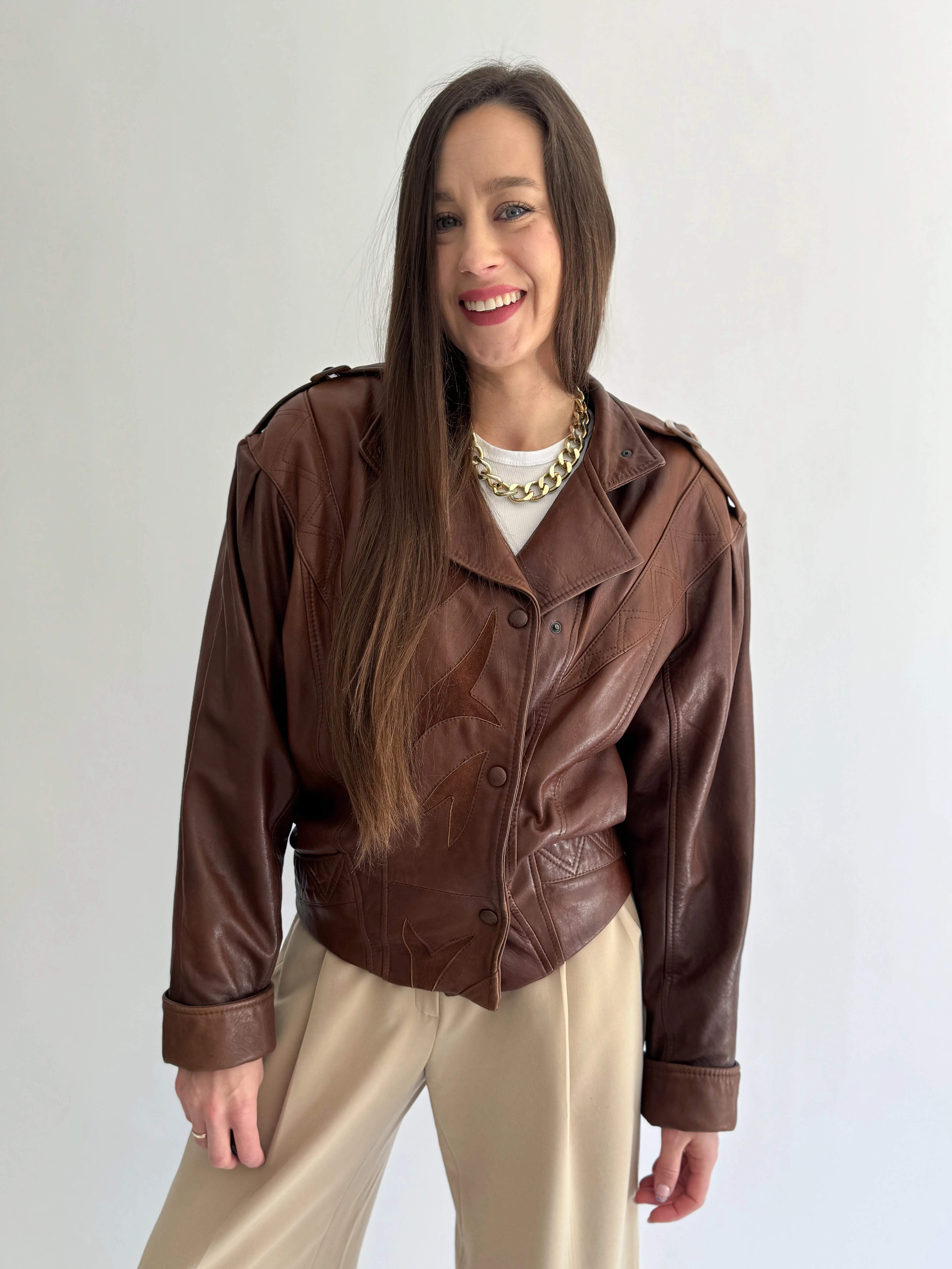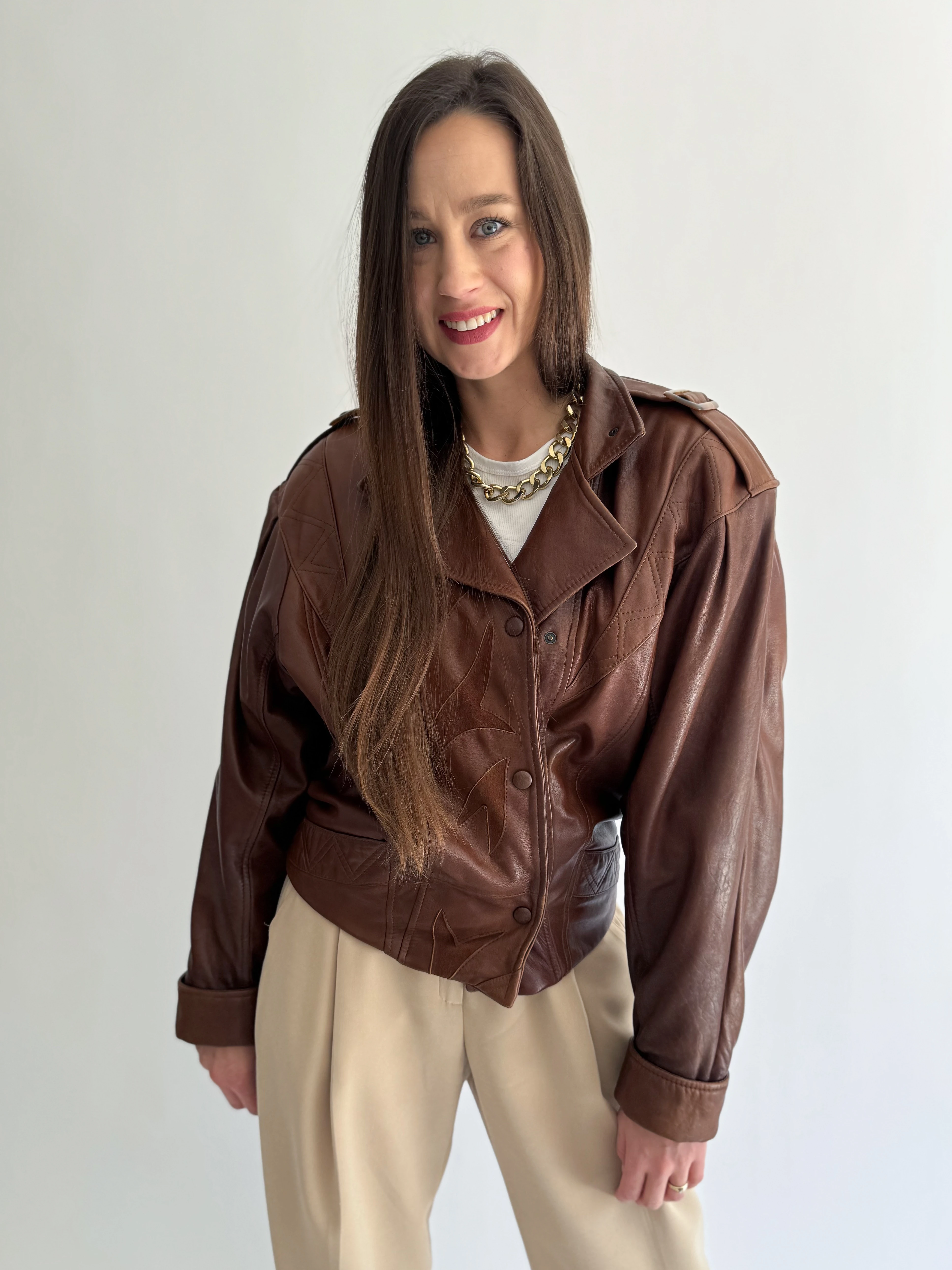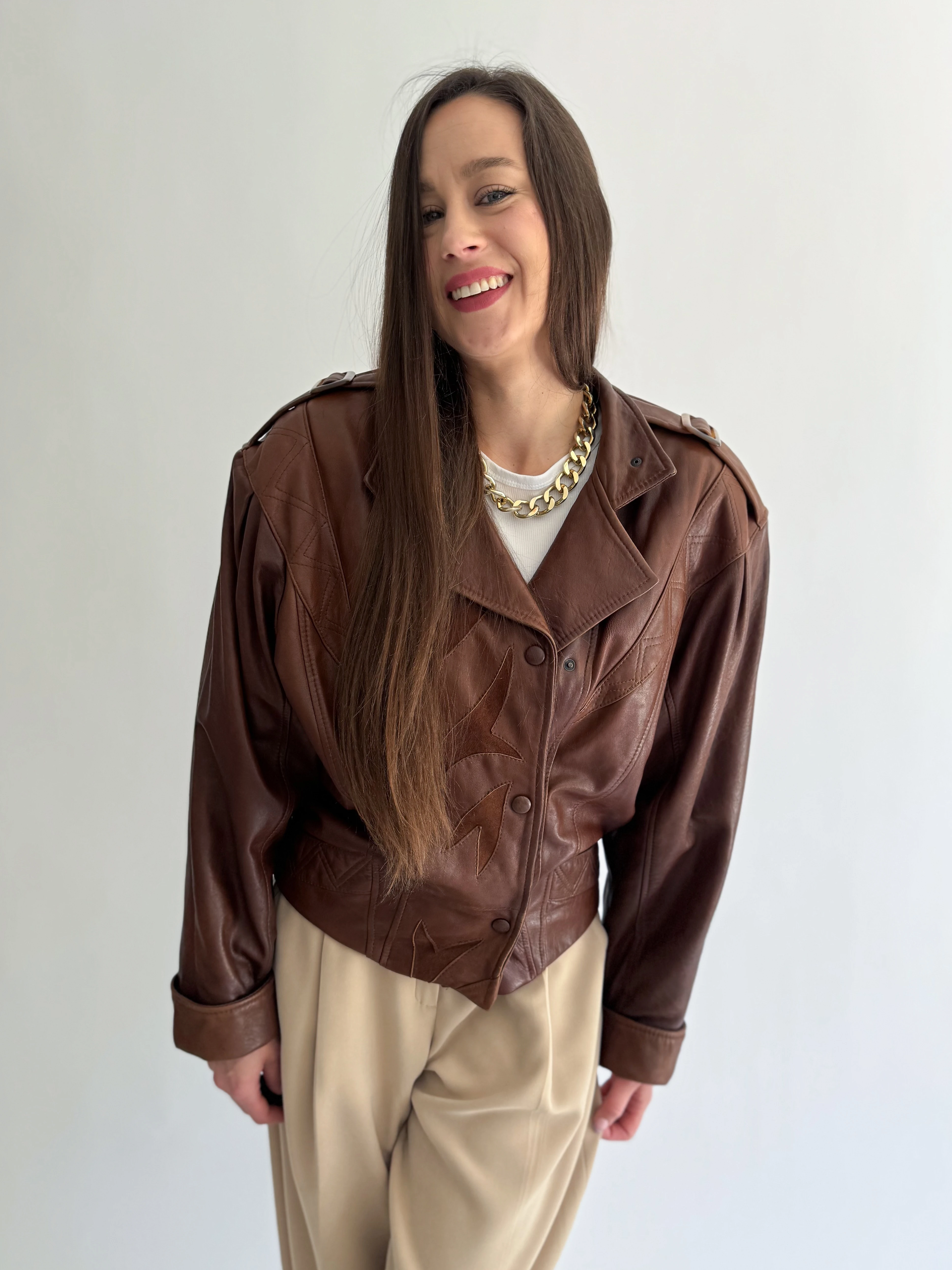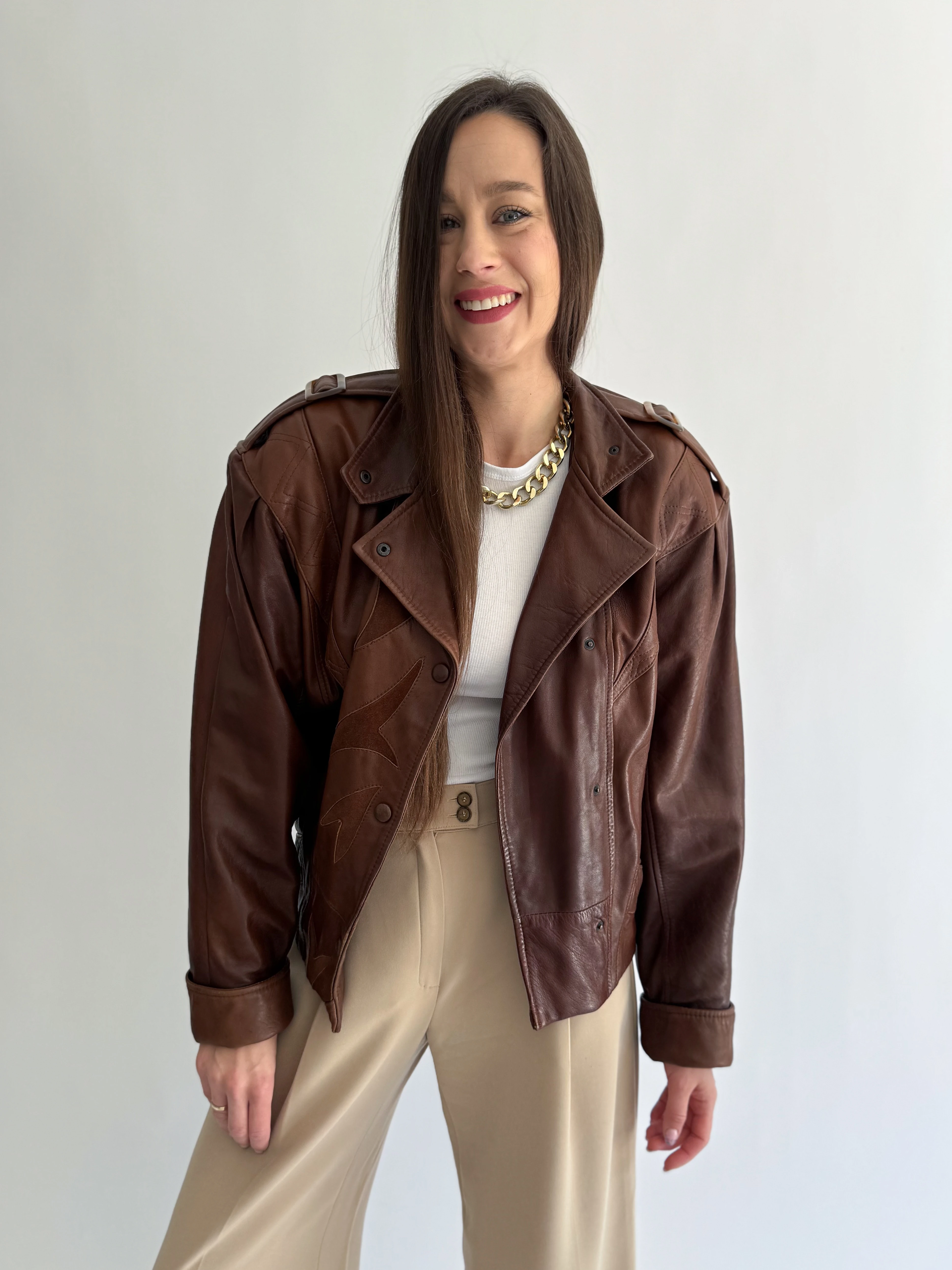 Skórzana, krótka, czekoladowa kurtka powstała z innej, skórzanej kurtki vintage.