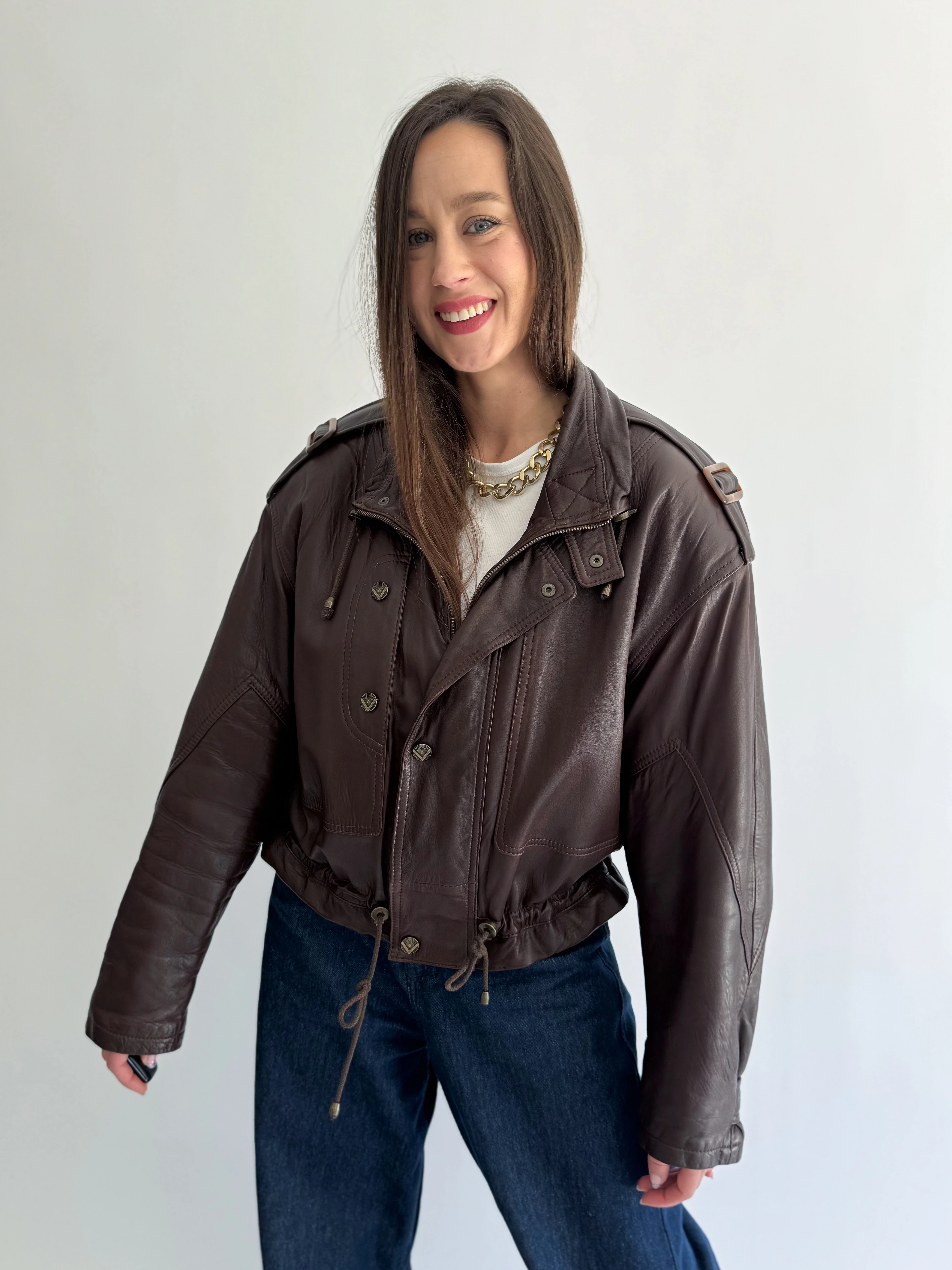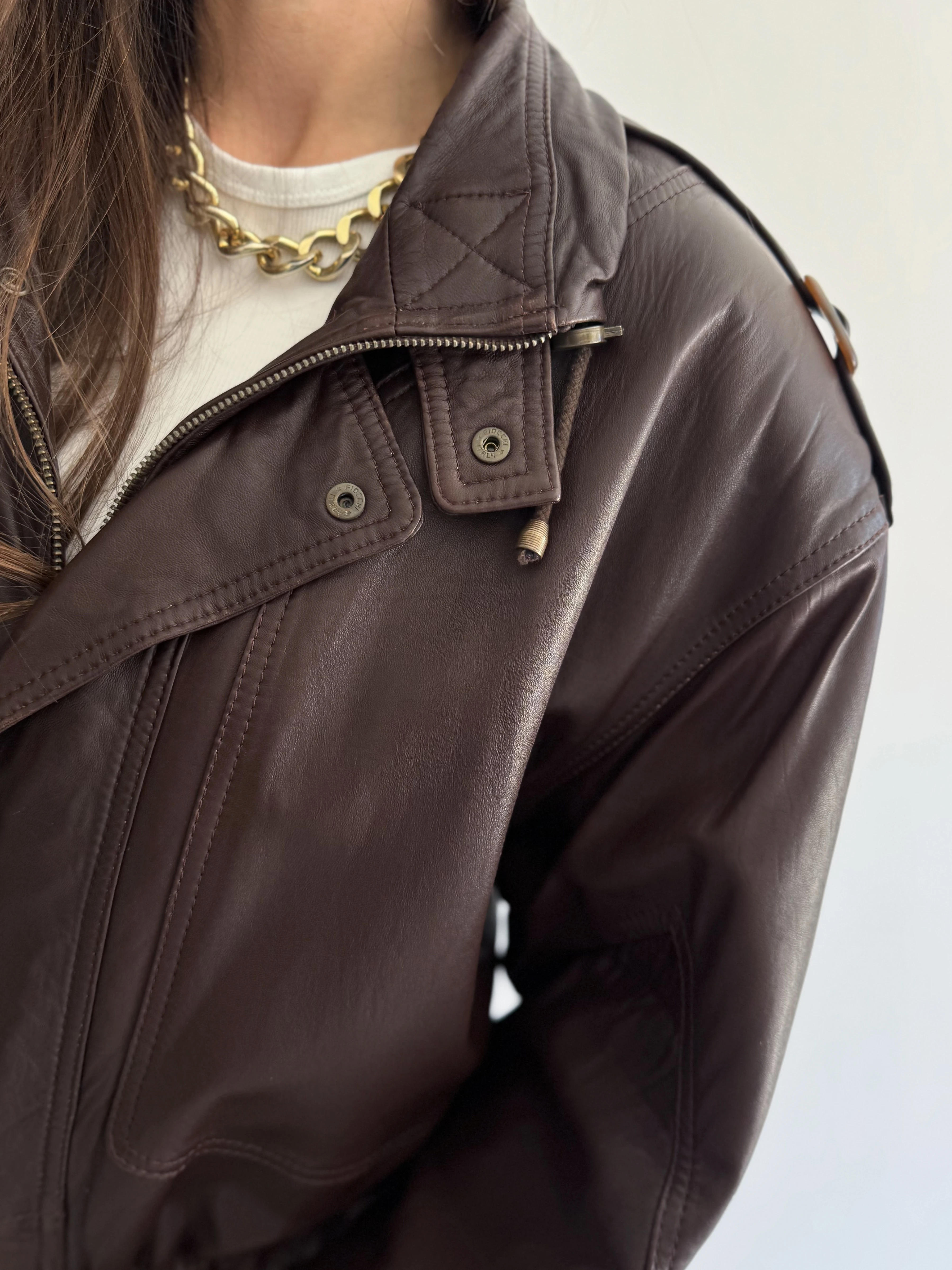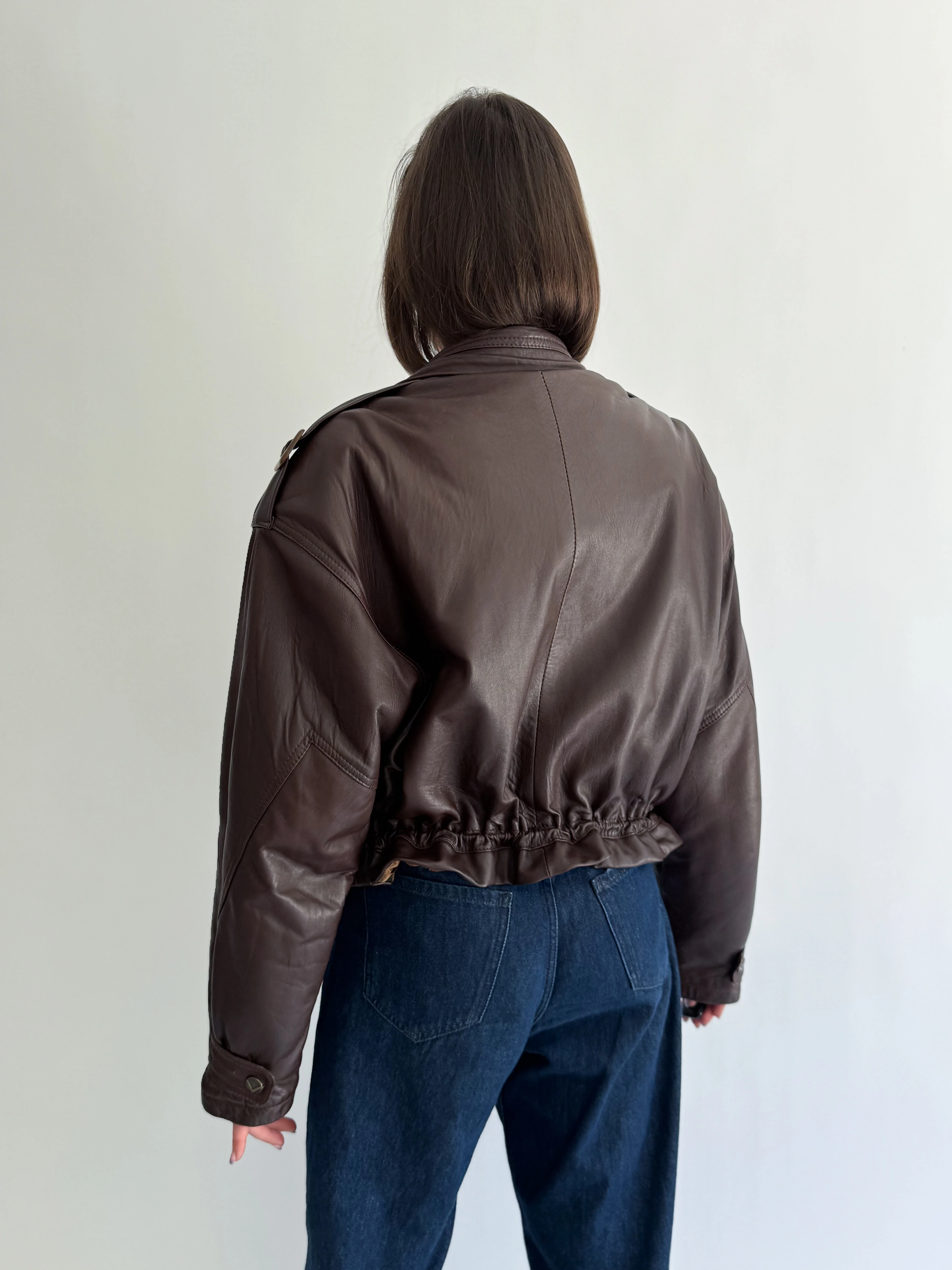 Skórzana, krótka, czekoladowa taliowana kurtka powstała z innej, skórzanej kurtki vintage.