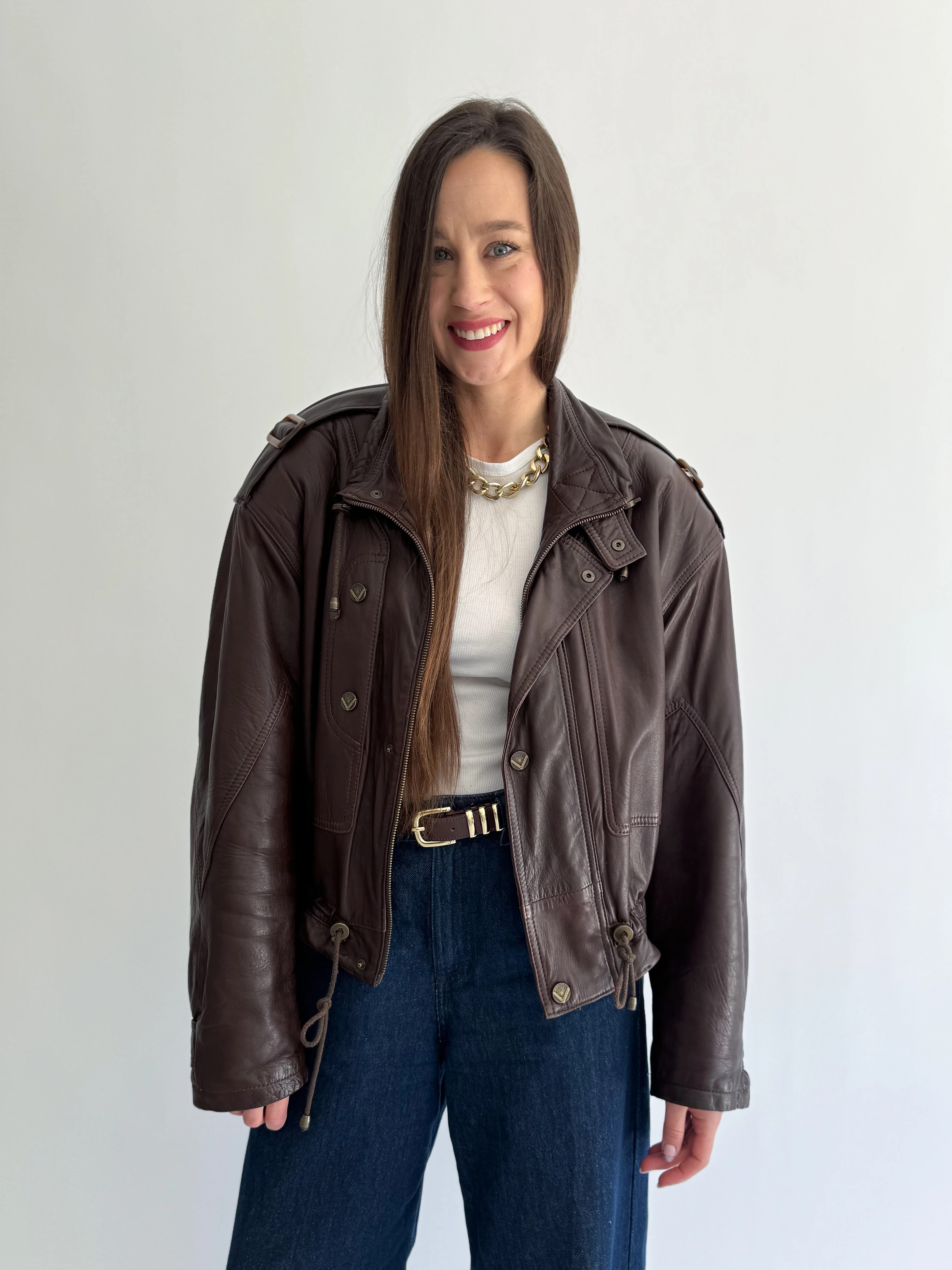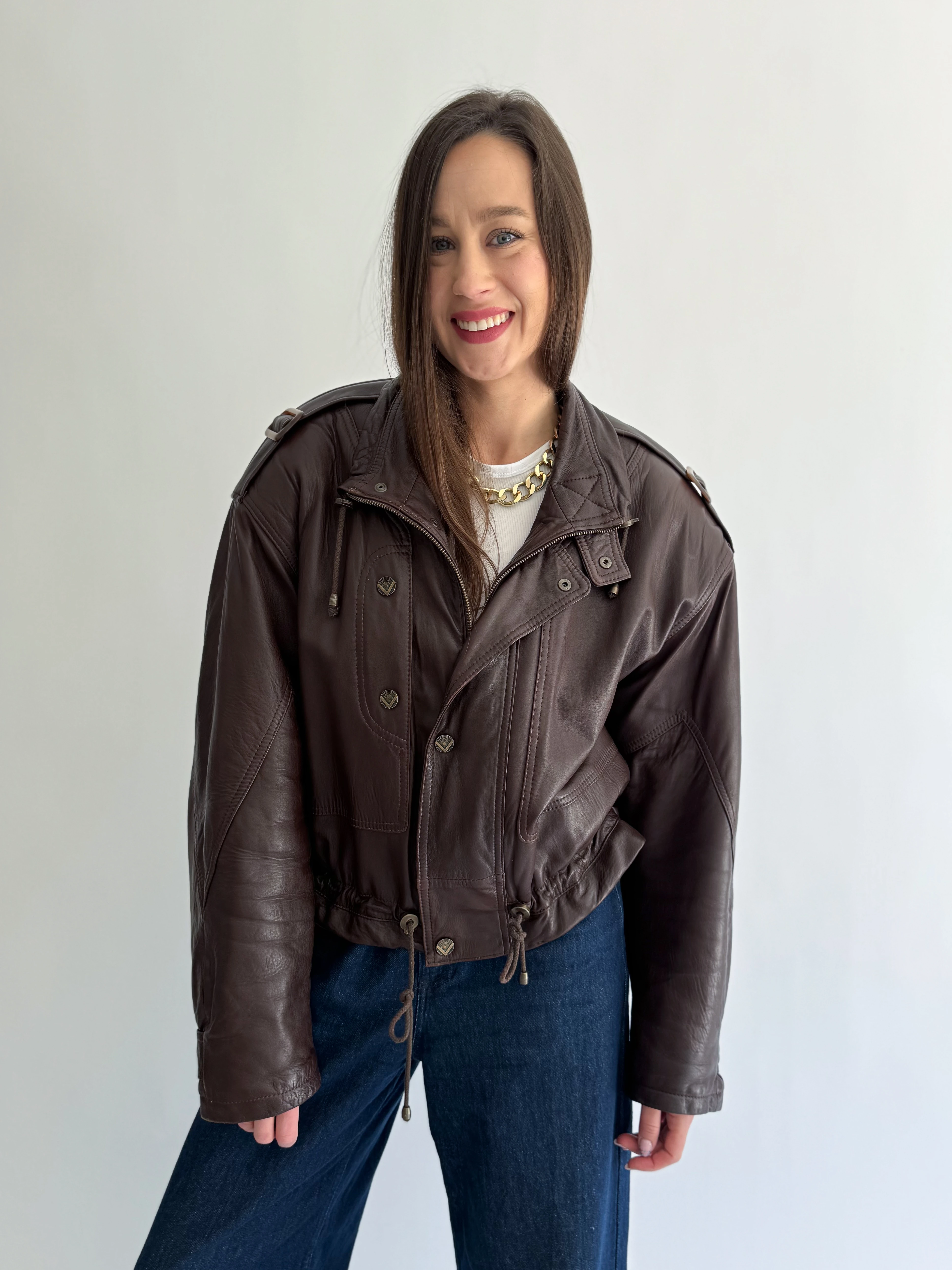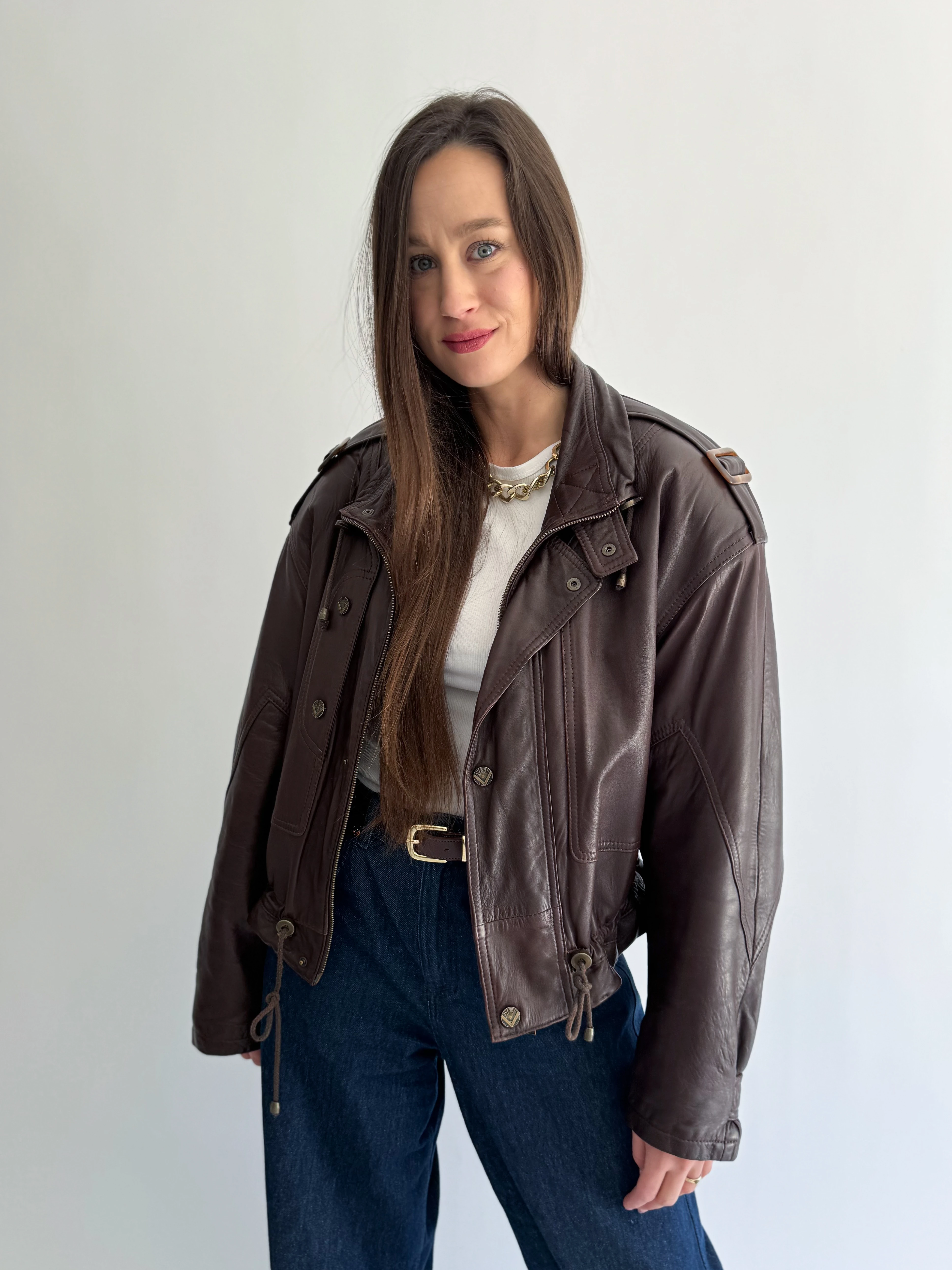Skórzana, krótka, czekoladowa taliowana kurtka powstała z innej, skórzanej kurtki vintage.