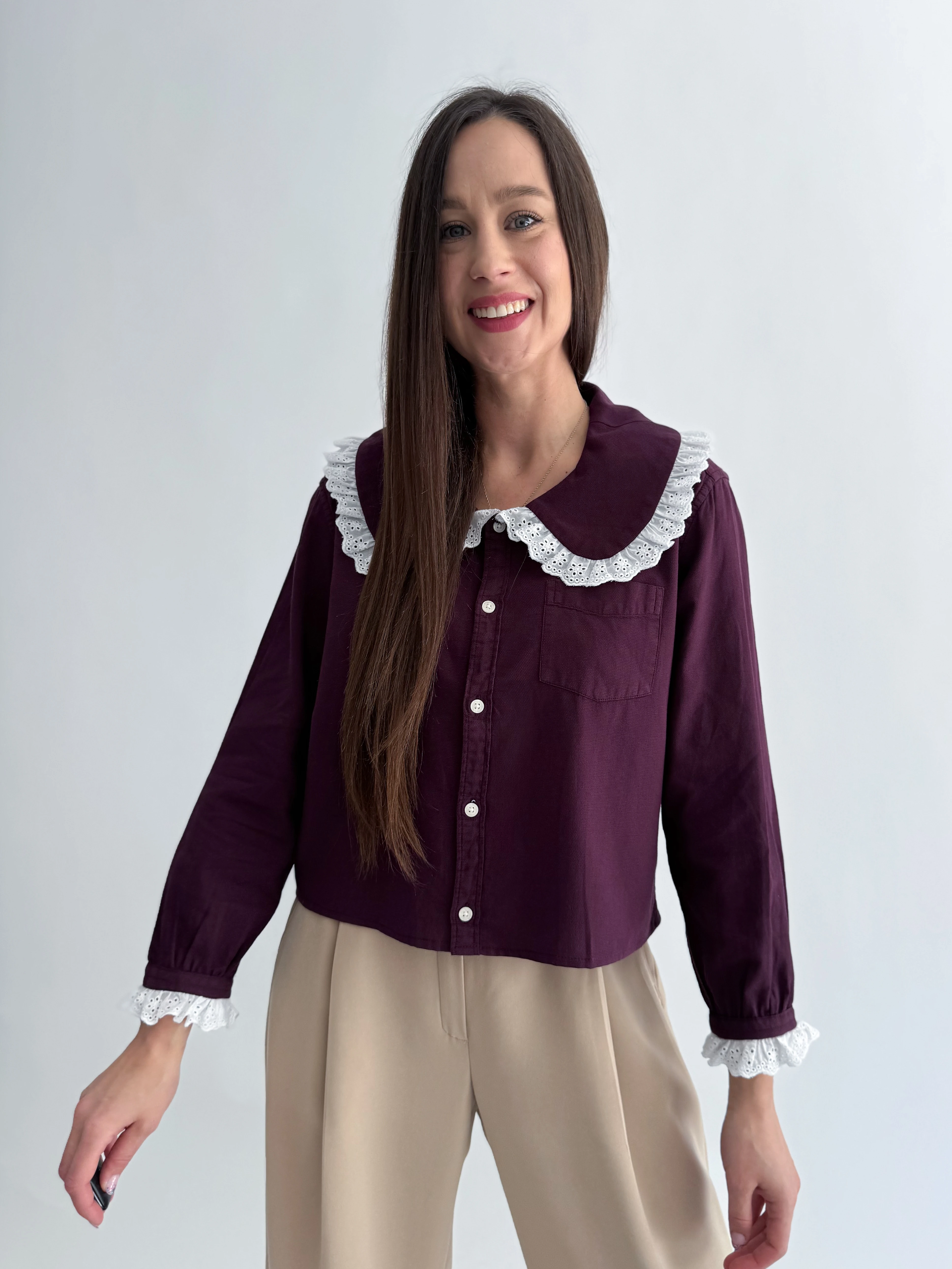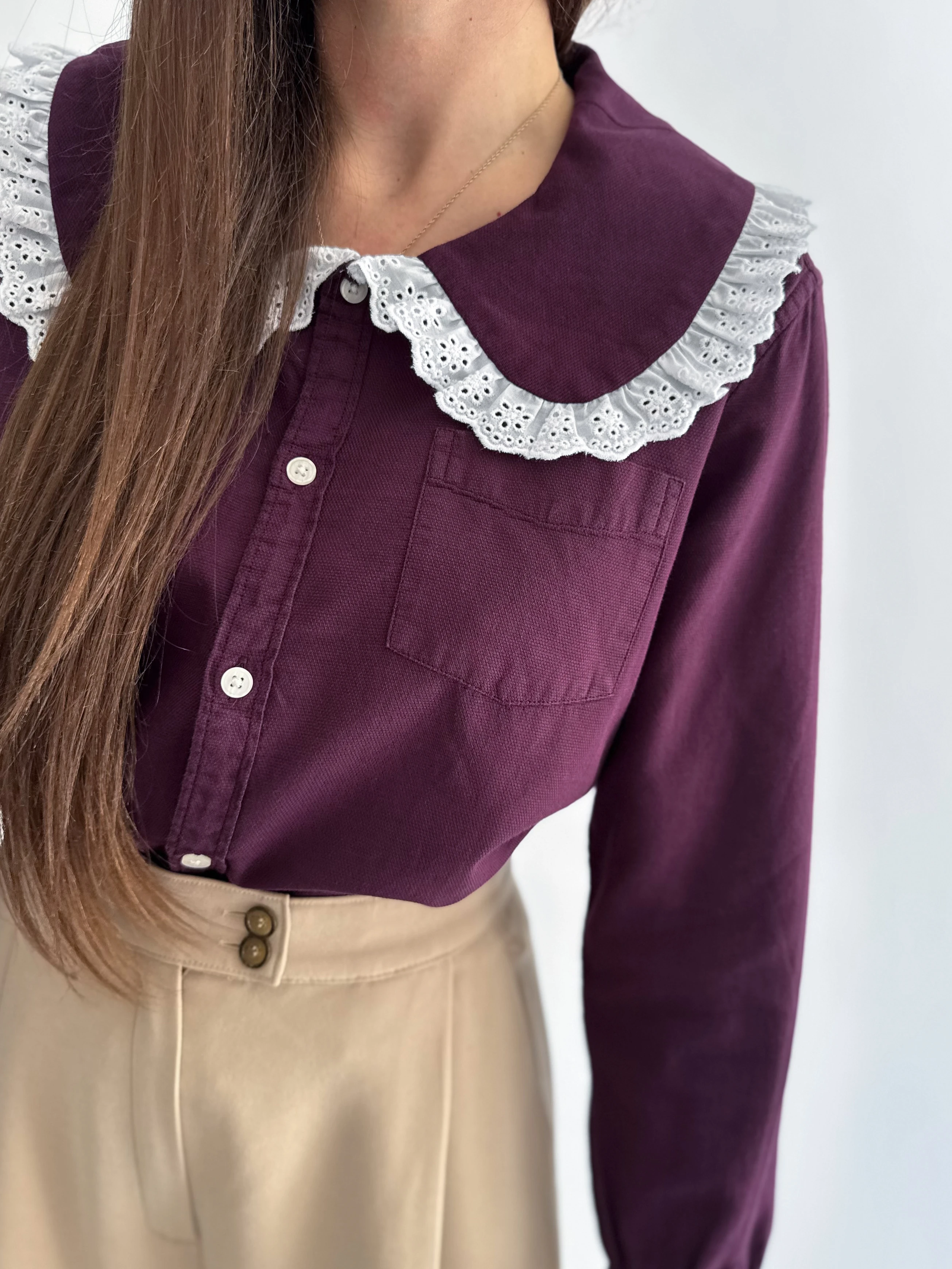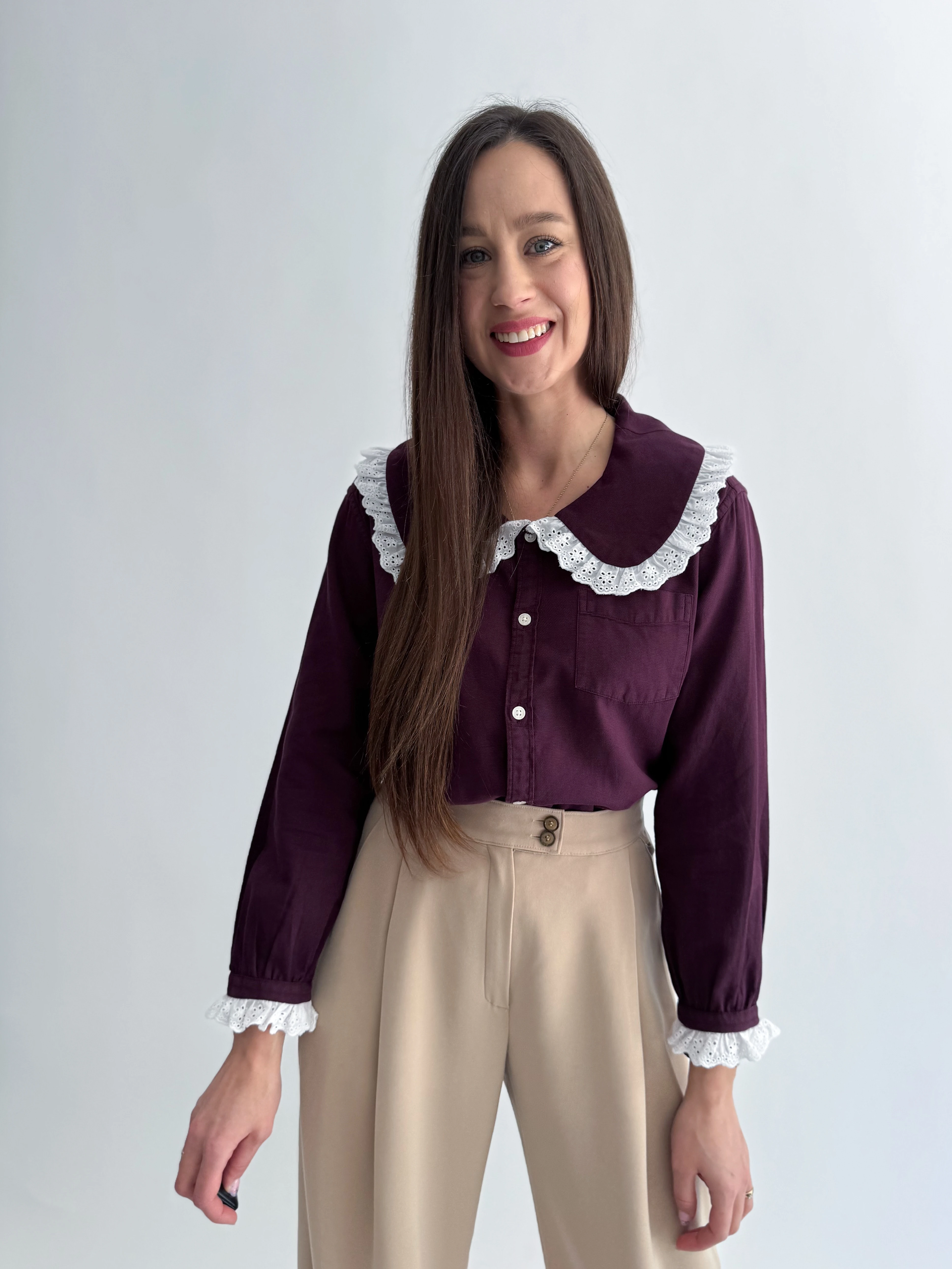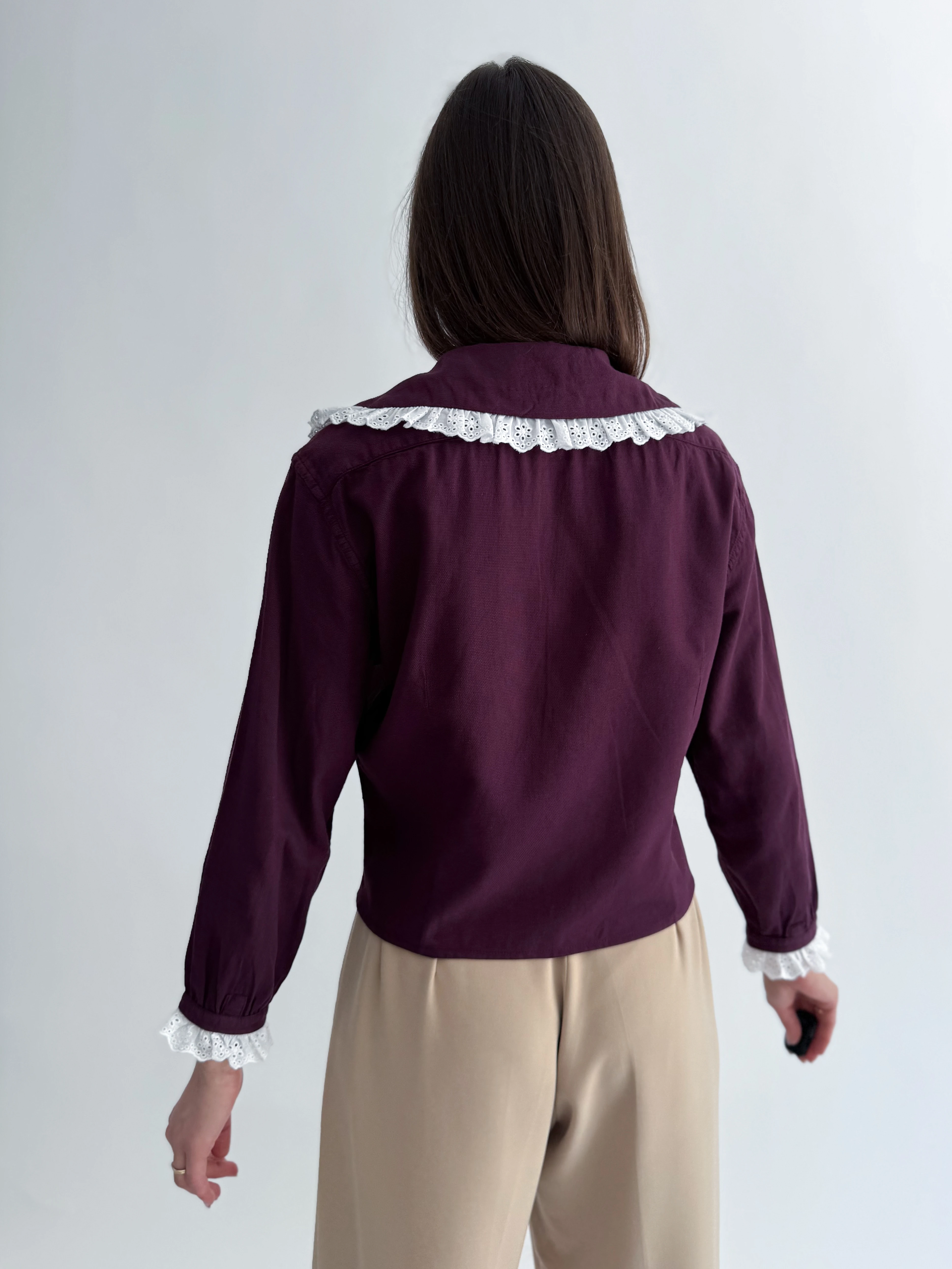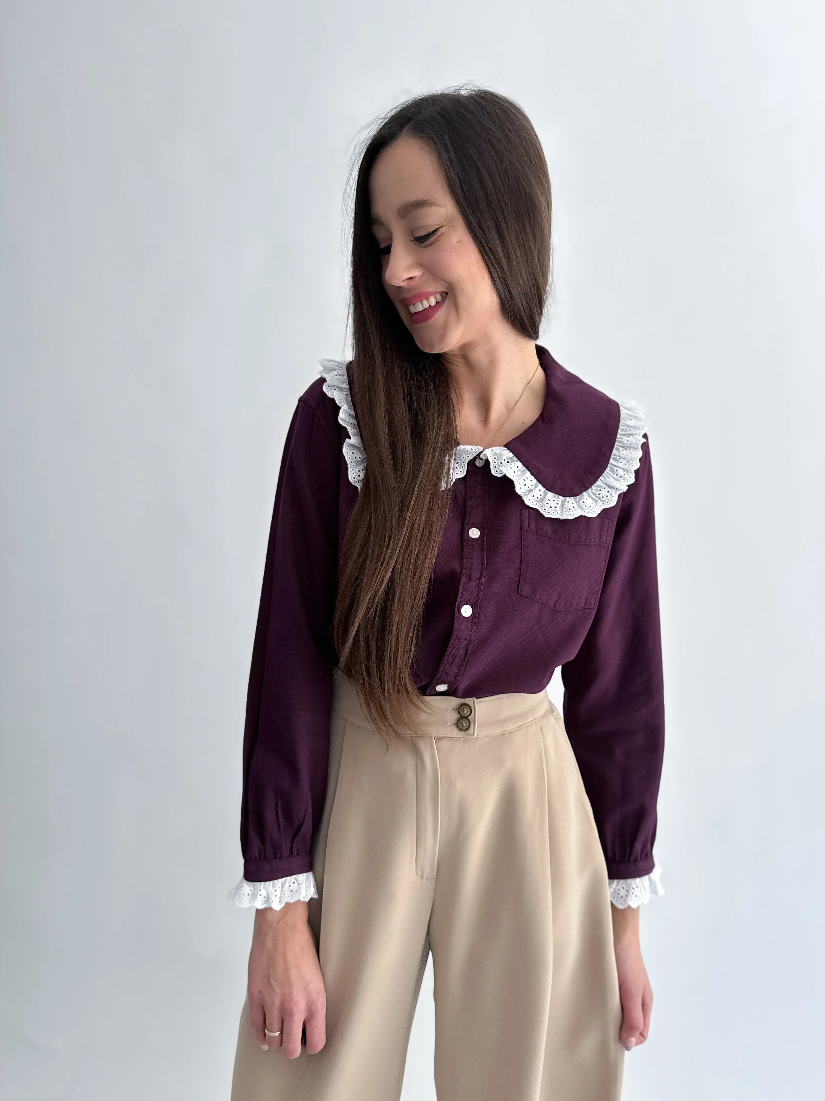 Bawełniana, upcyclingowa koszula z kołnierzem, powstała z męskiej koszuli z drugiego obiegu. Koszula zyskała przepiękny duży kołnierz zakończony koronką, która znalazła się również na zakończeniu rękawów. Świetnie wygląda luźno jak i włożona w spodnie/spódnicę.