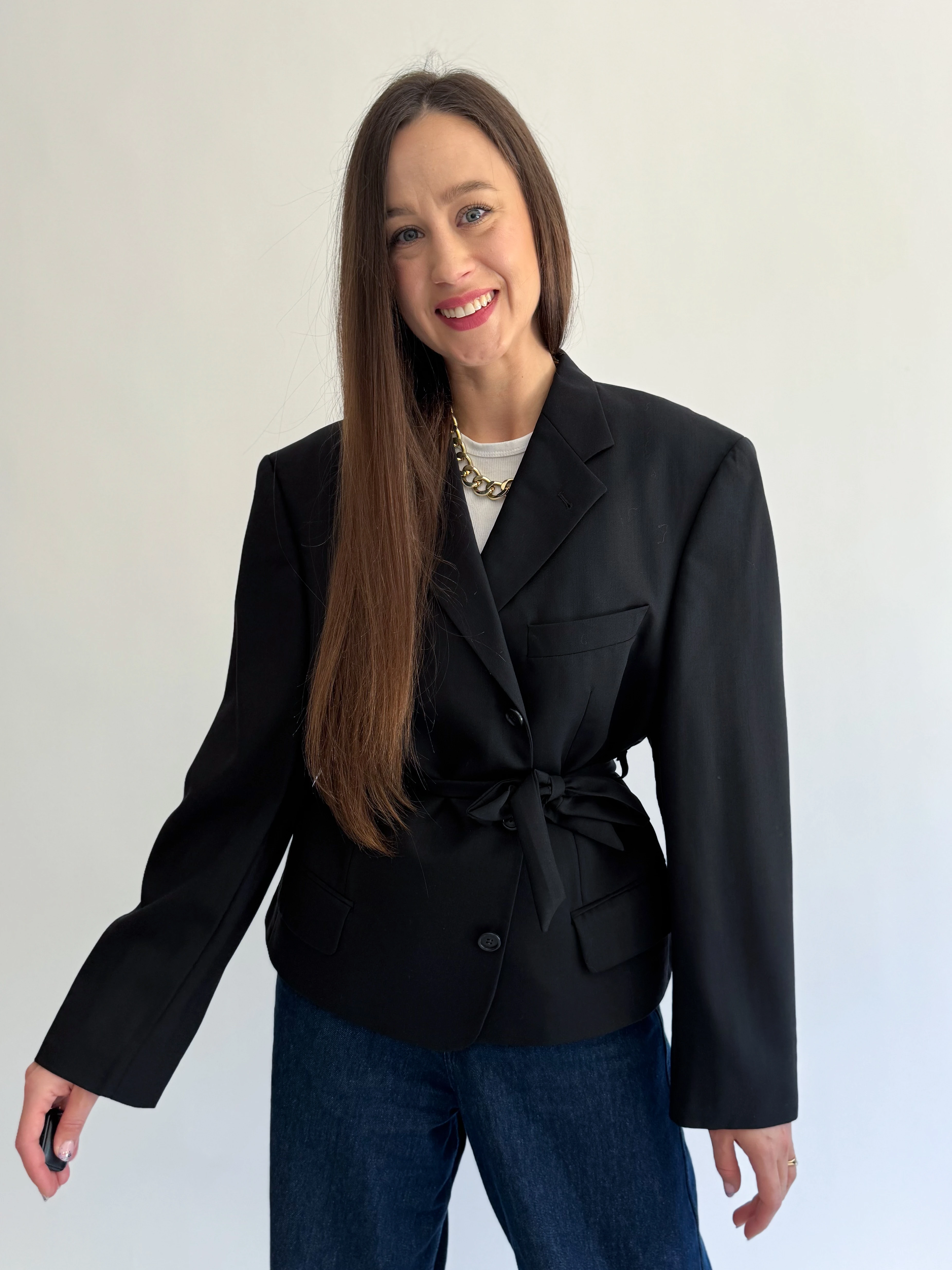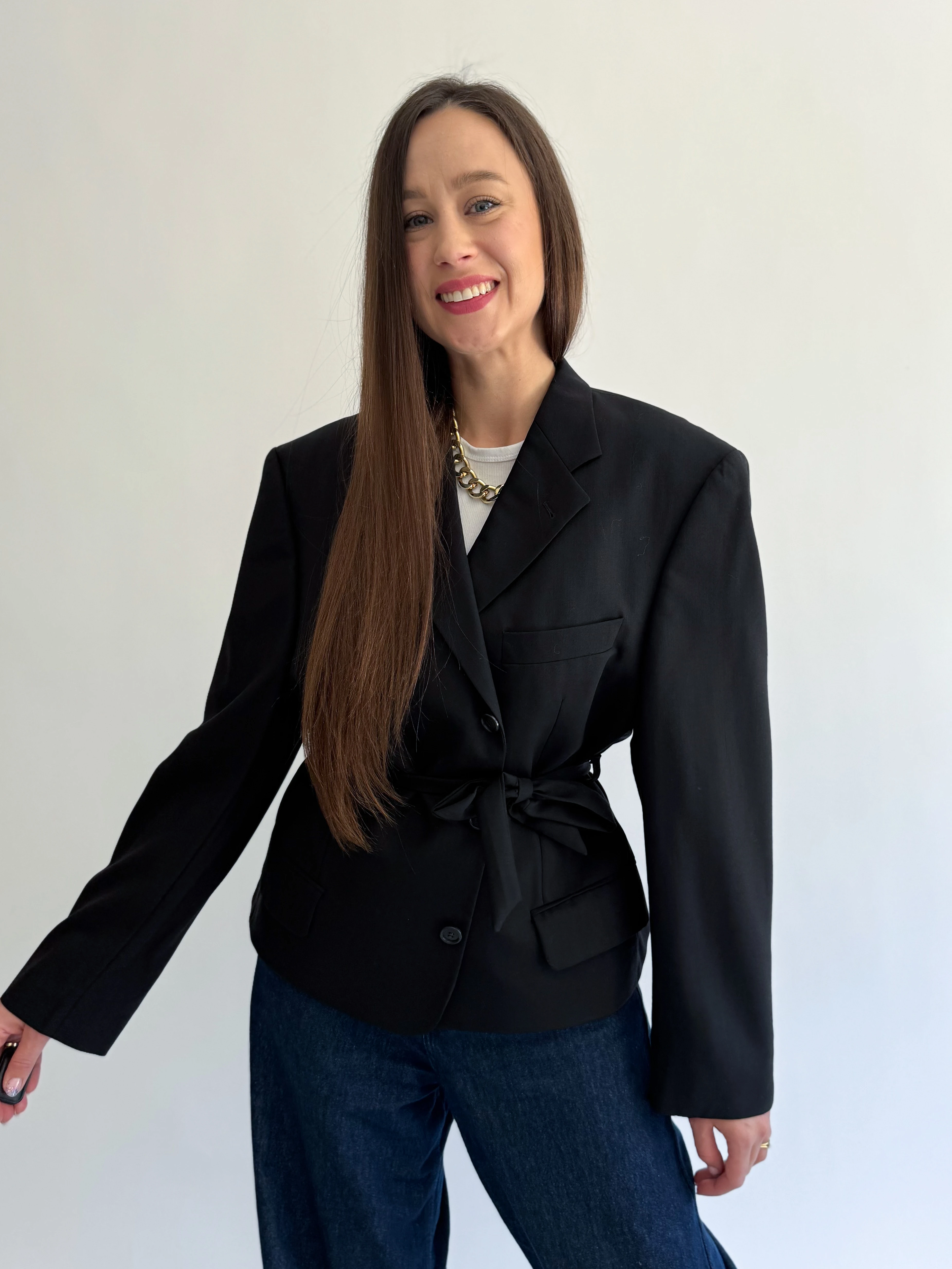 Marynarka z paskiem w talii o lekko skróconym fasonie, powstała z męskiej marynarki z drugiego obiegu o szlachetnym składzie.