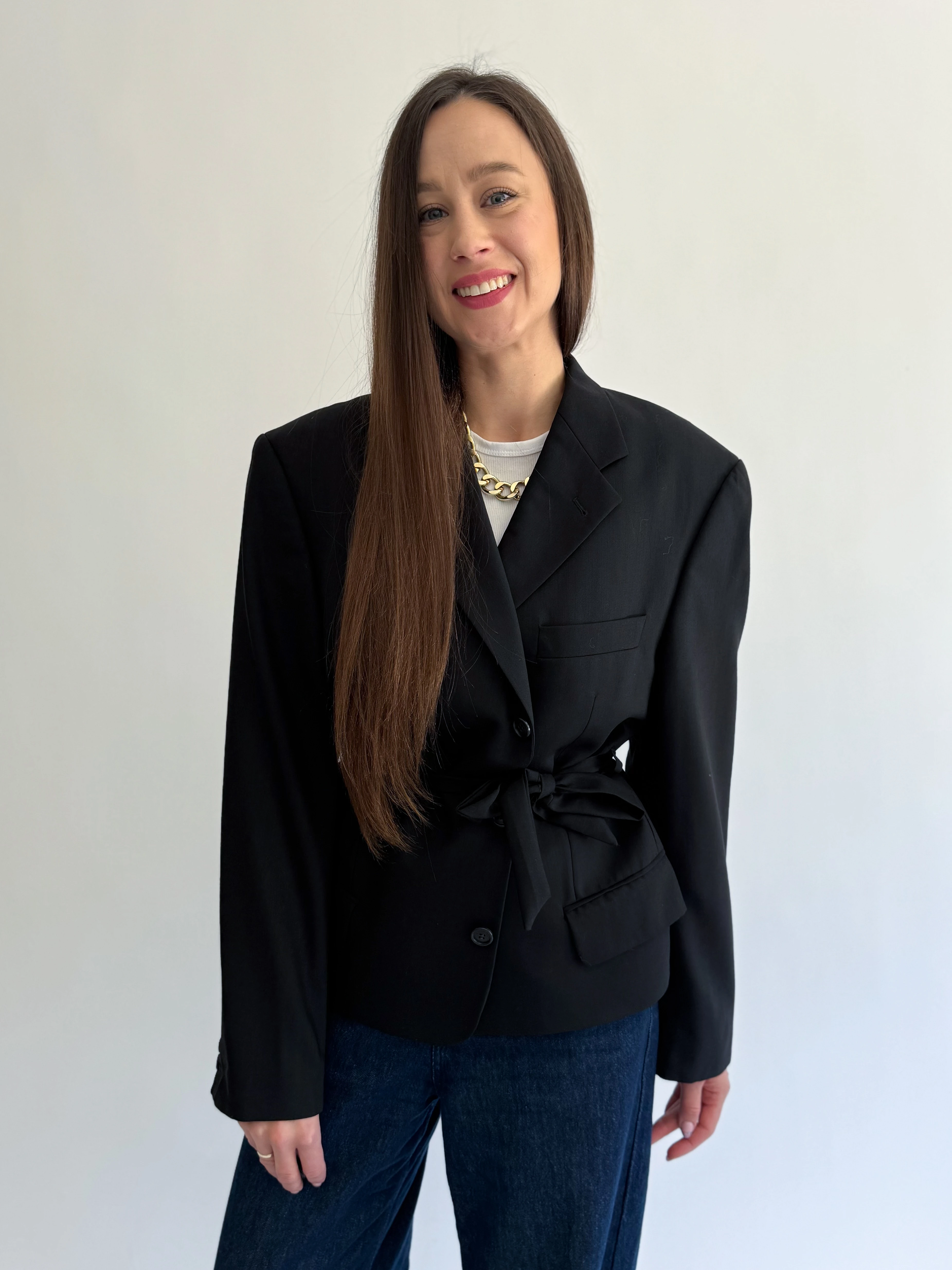 Dopasowując marynarkę do kobiecej sylwetki poprzez skrócenie i taliowanie, nadaliśmy jej drugie życie.