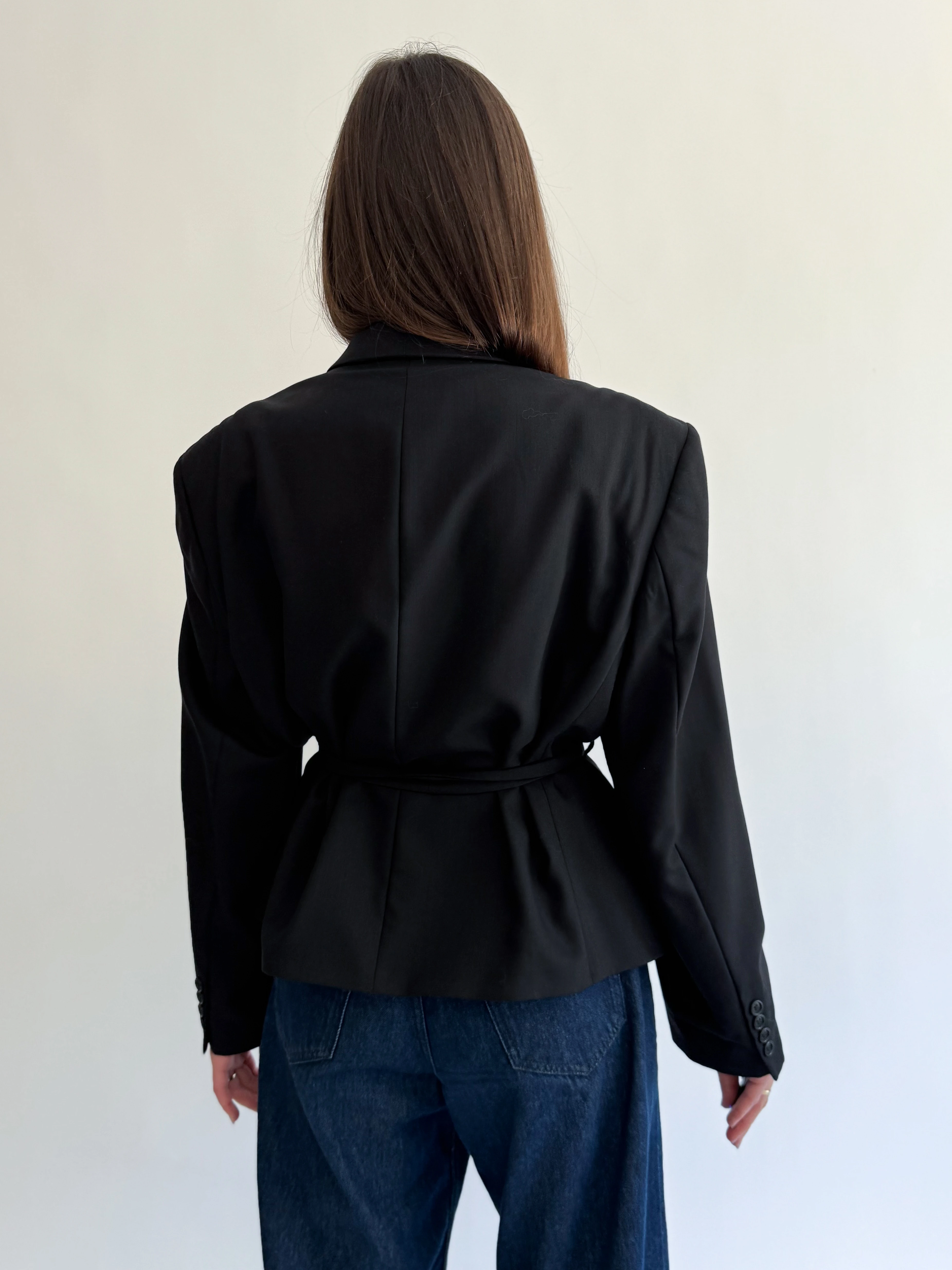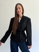 UWAGI: Marynarka ma mocno zaznaczone ramiona, ale dzięki odpowiedniemu wiązaniu w talli (bez zapinania guzików) dopasuje się od rozmiaru M do XL.