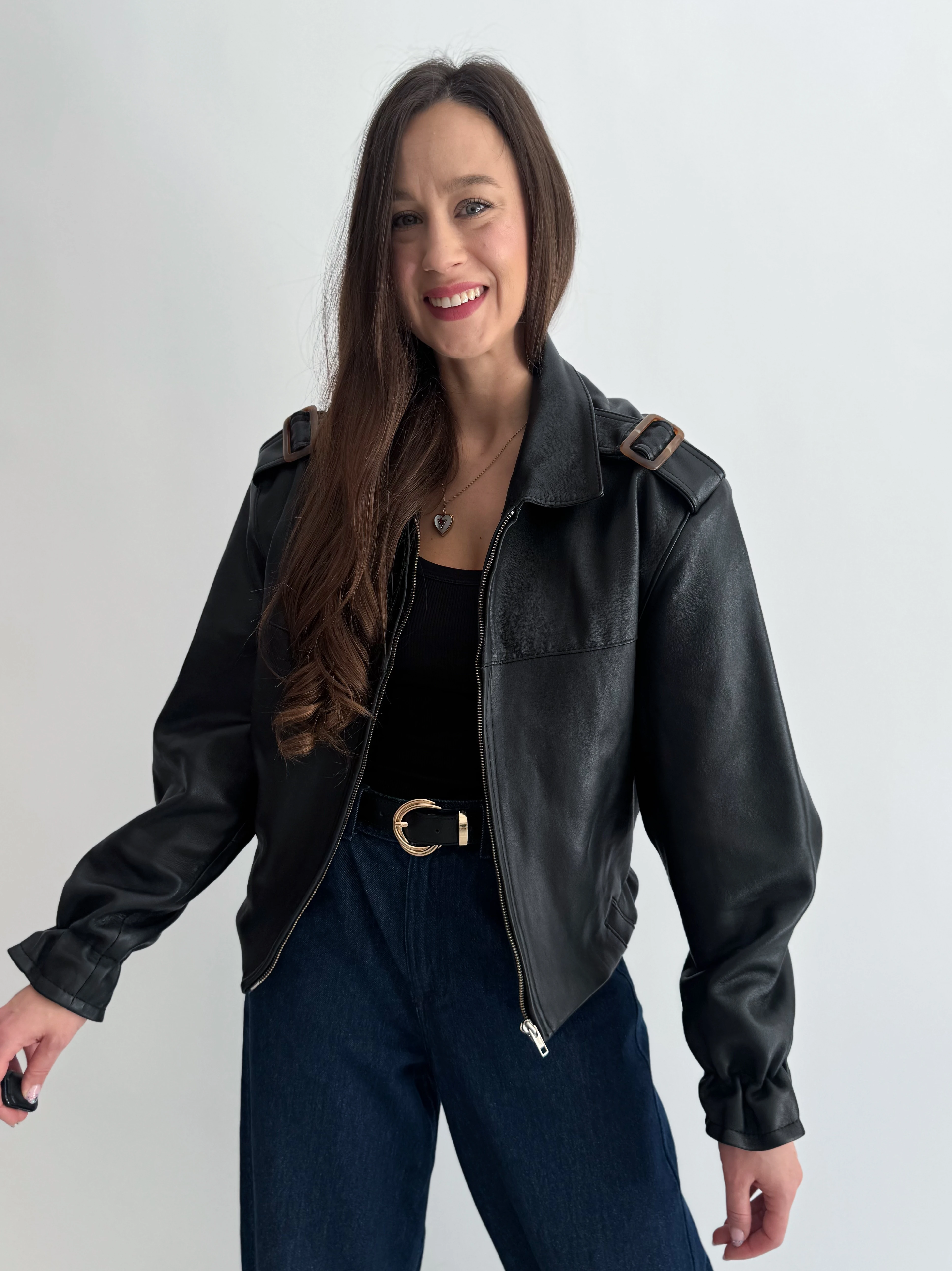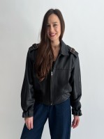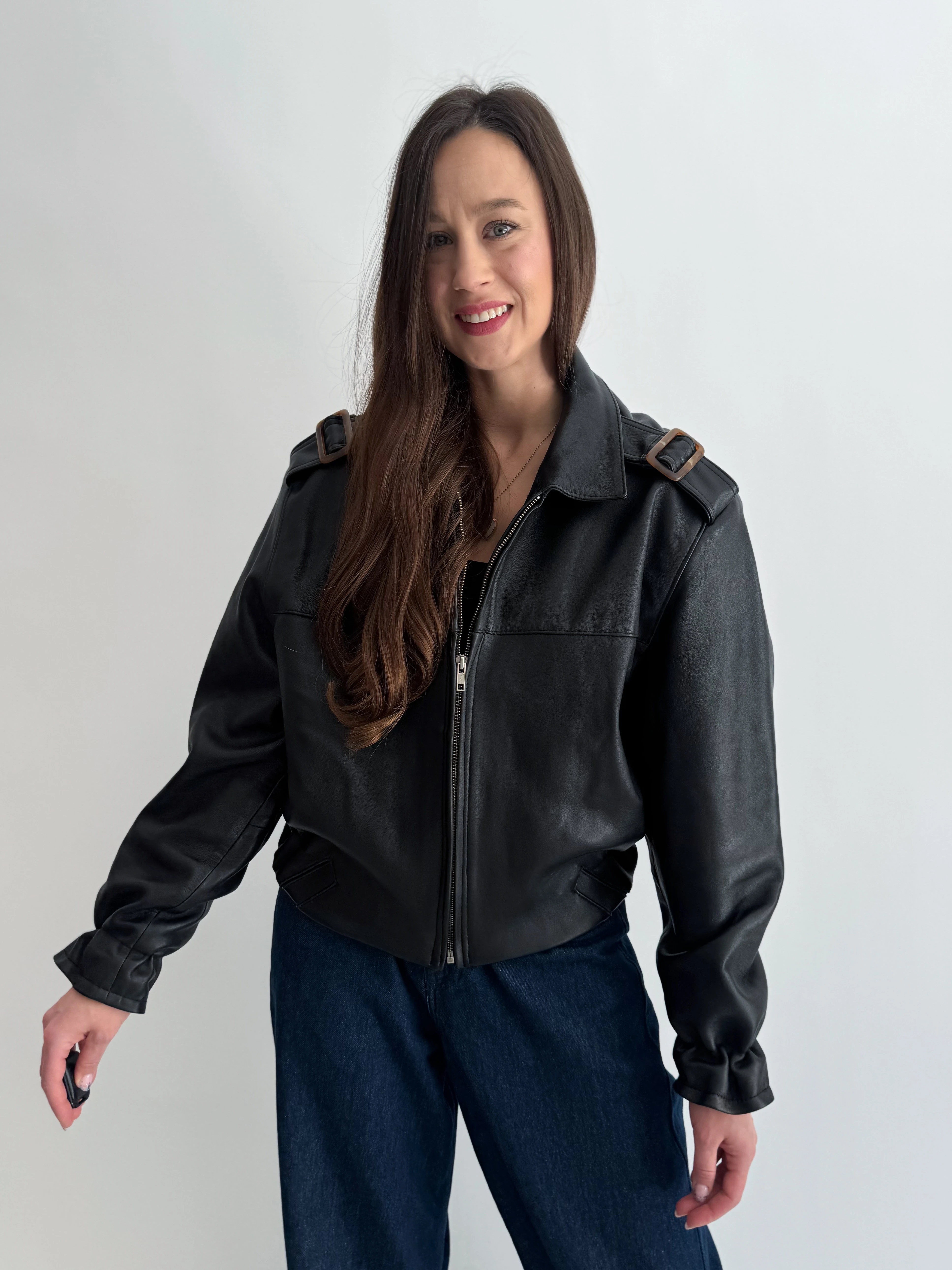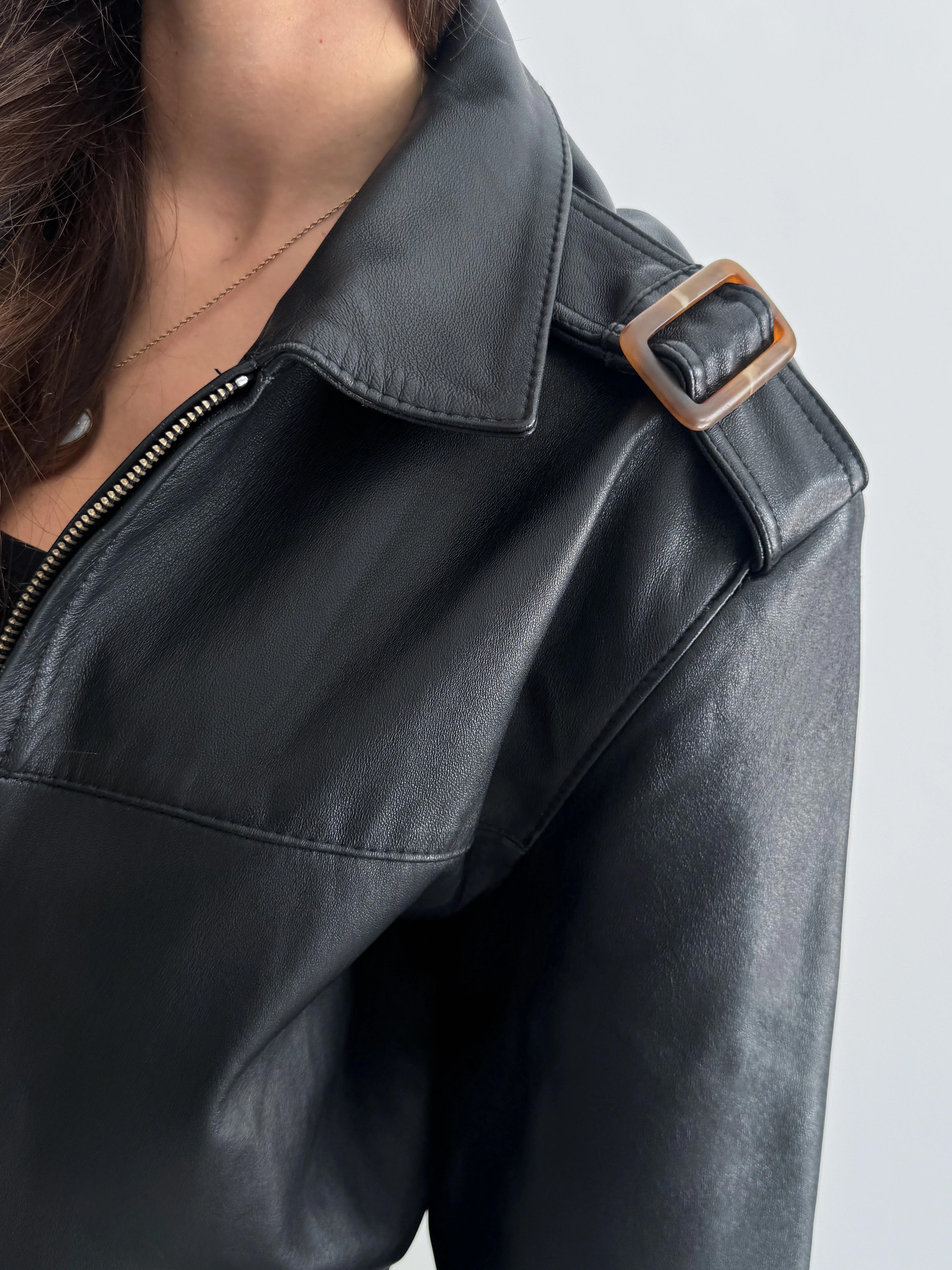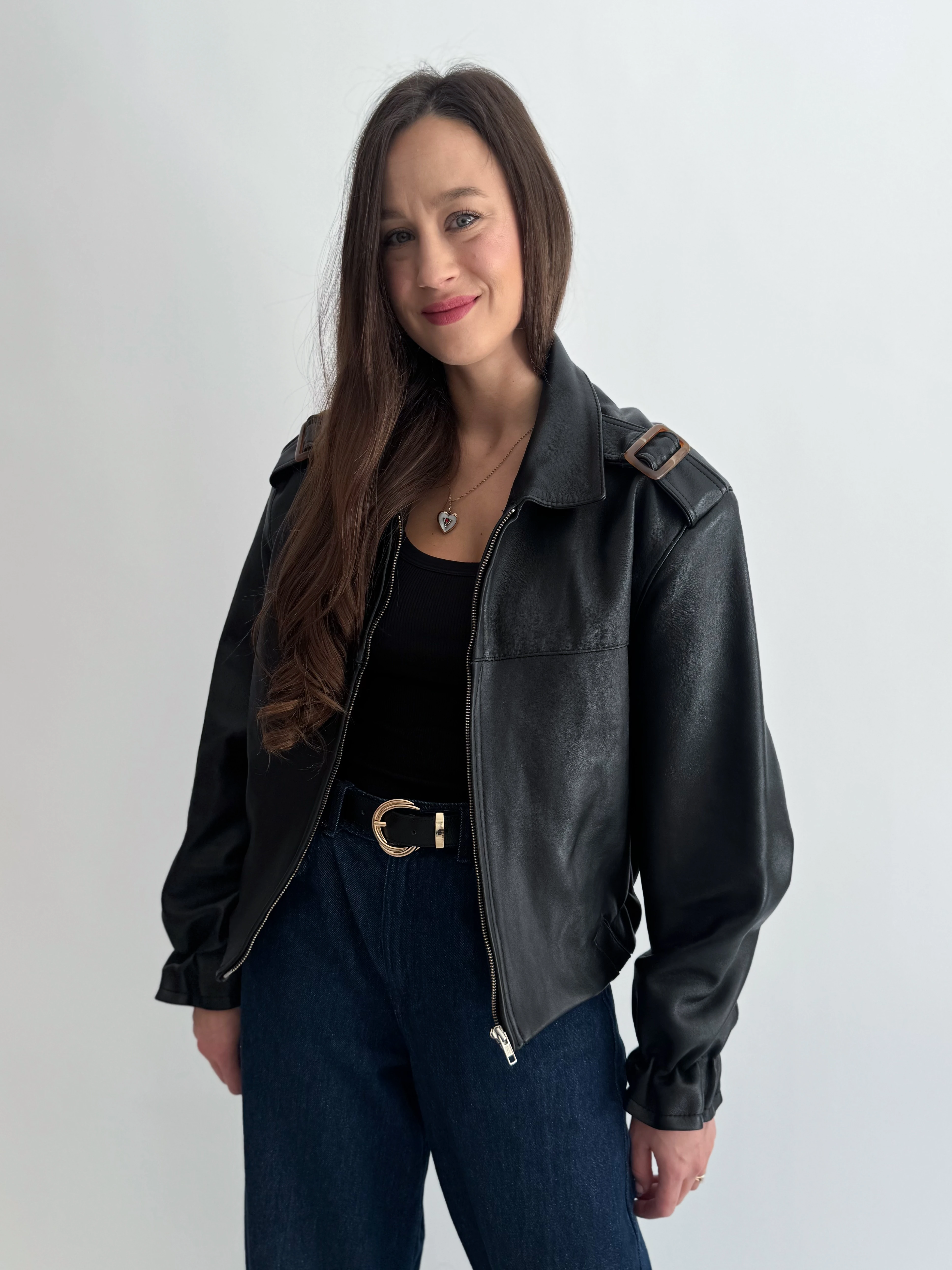 Skórzana, krótka, taliowana kurtka powstała z innej, skórzanej kurtki vintage.