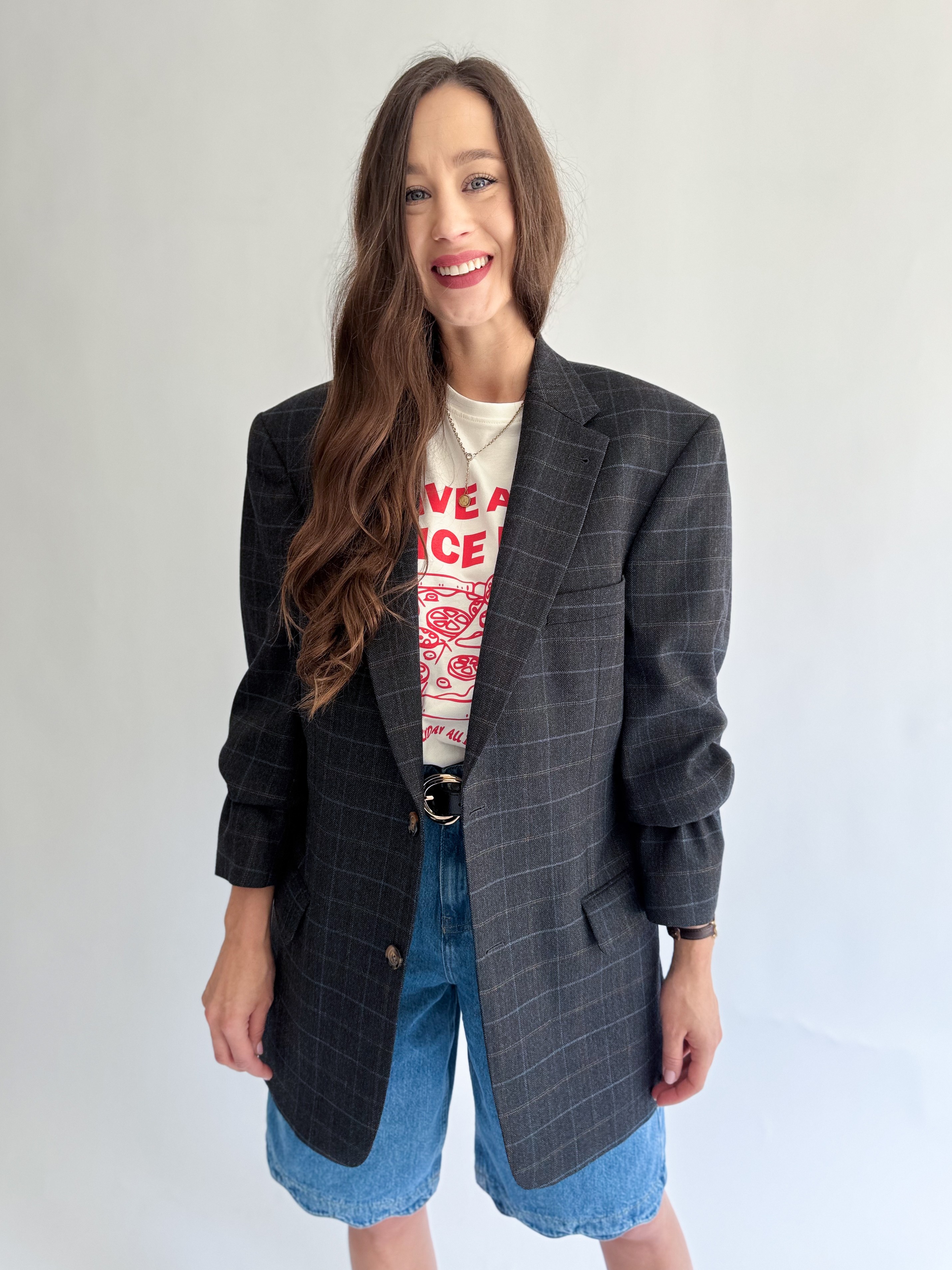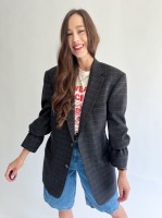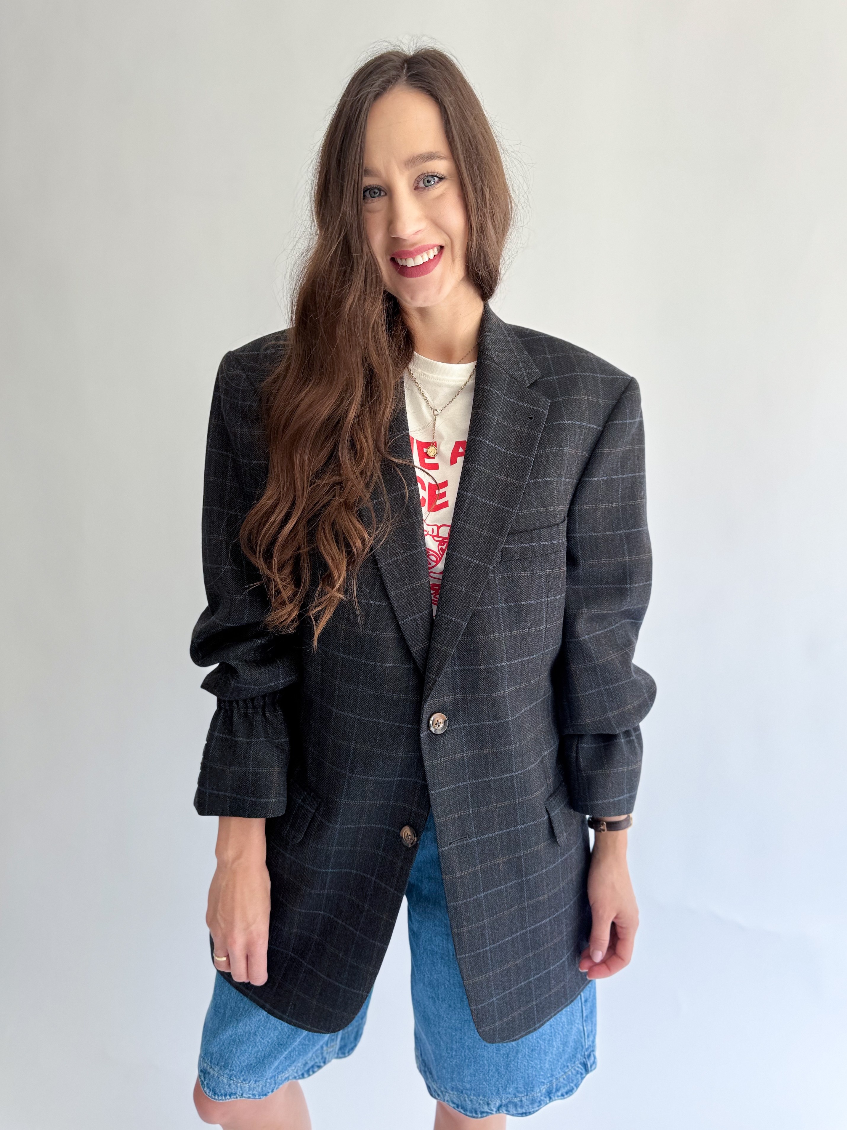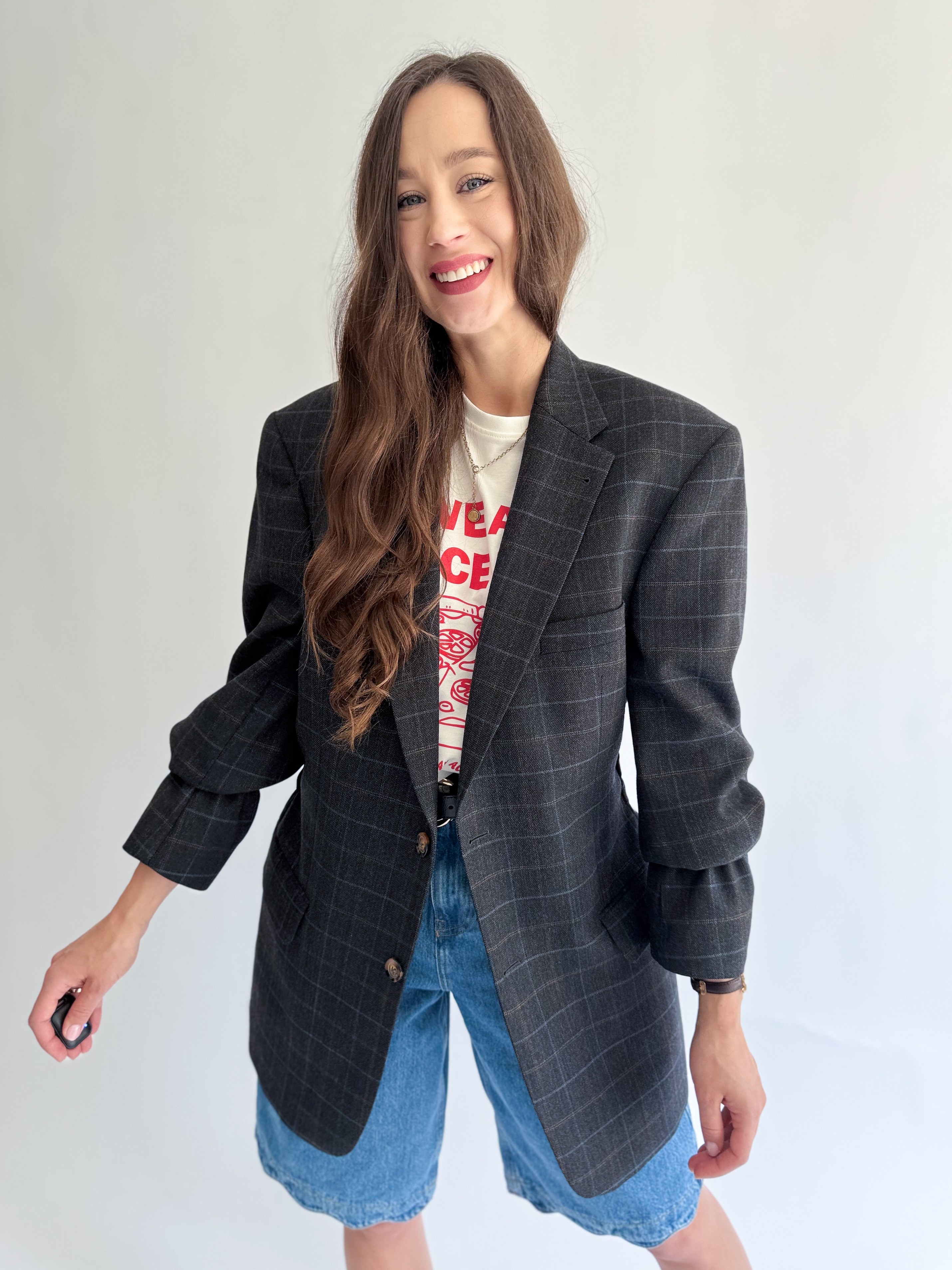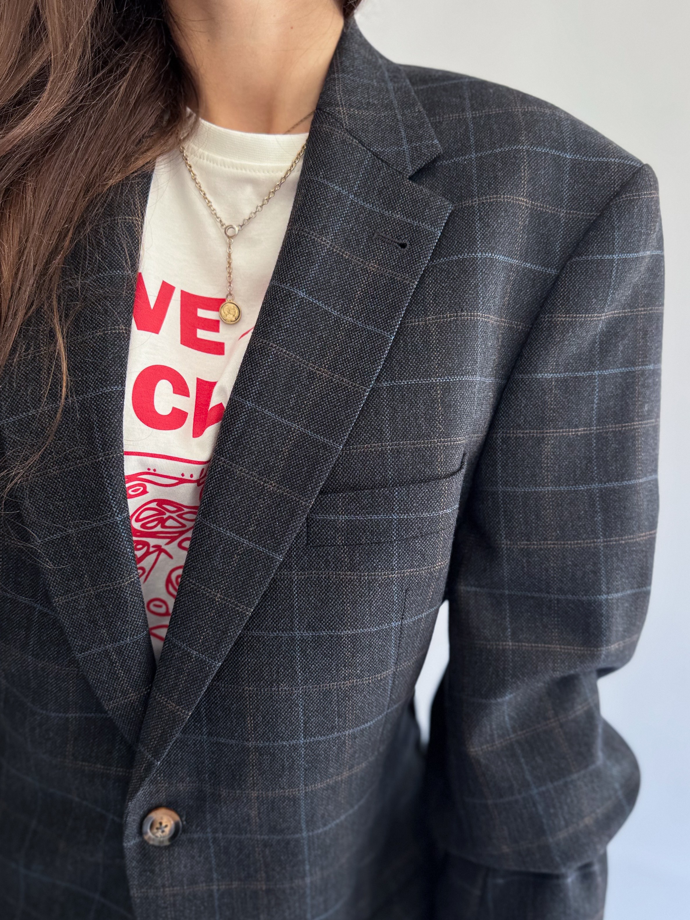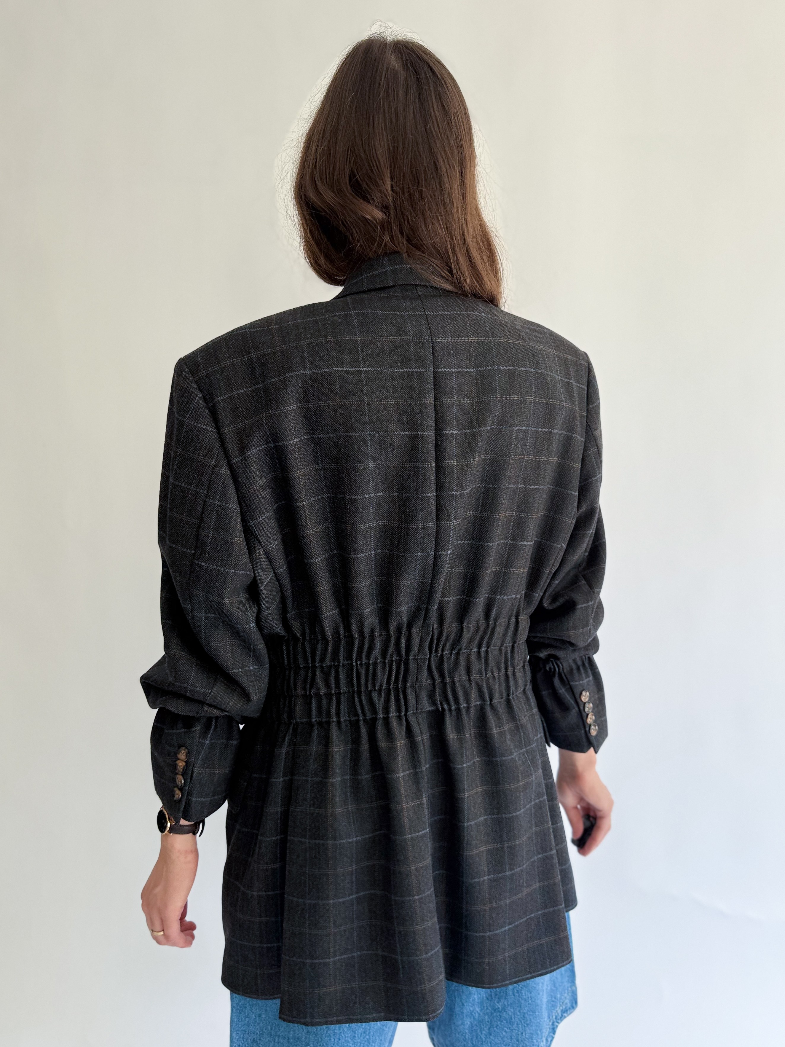 Długa, taliowana, grafitowa marynarka w niebiesko-brązową kratkę, powstała z męskiej marynarki z drugiego obiegu o szlachetnym składzie.