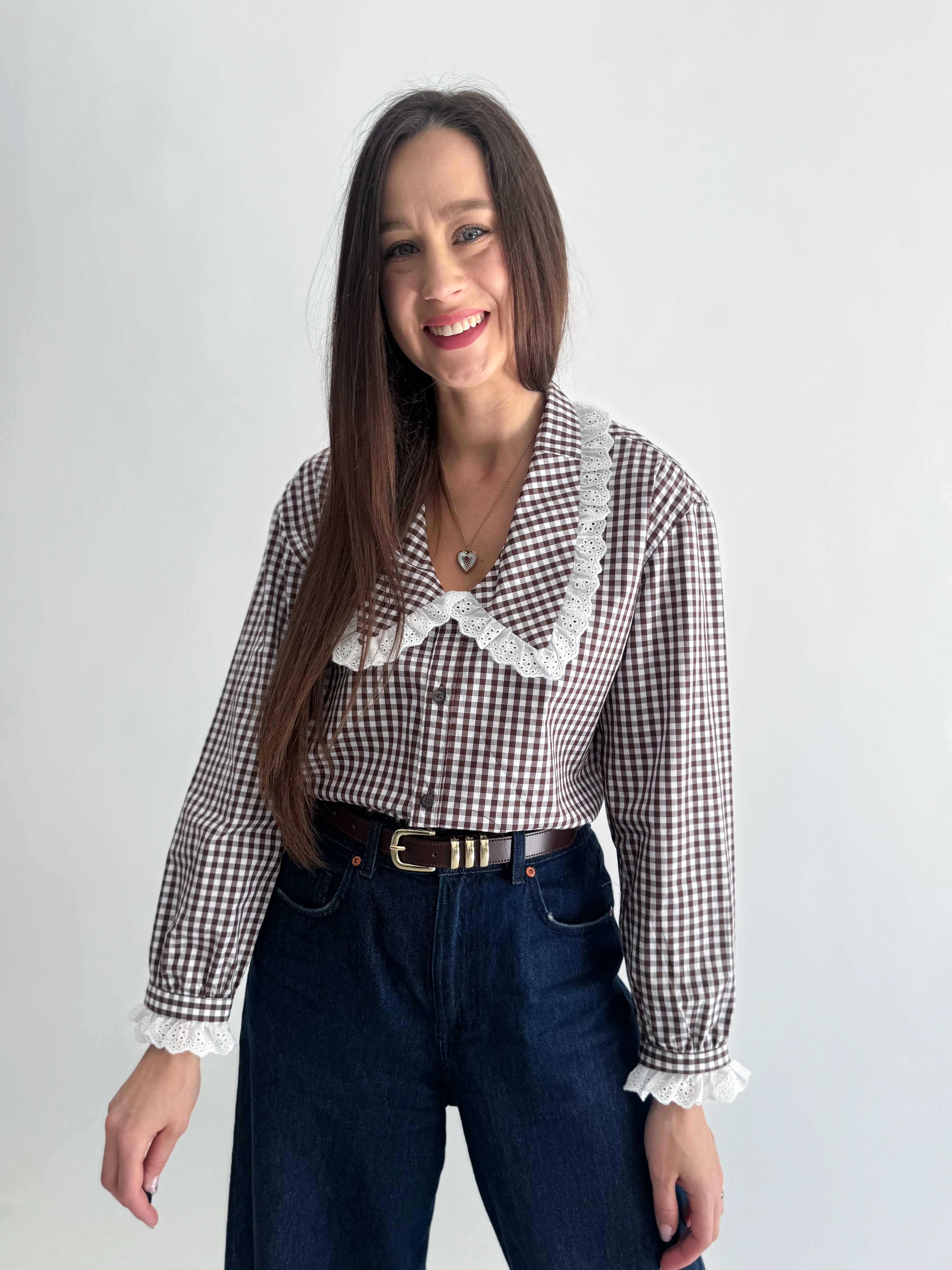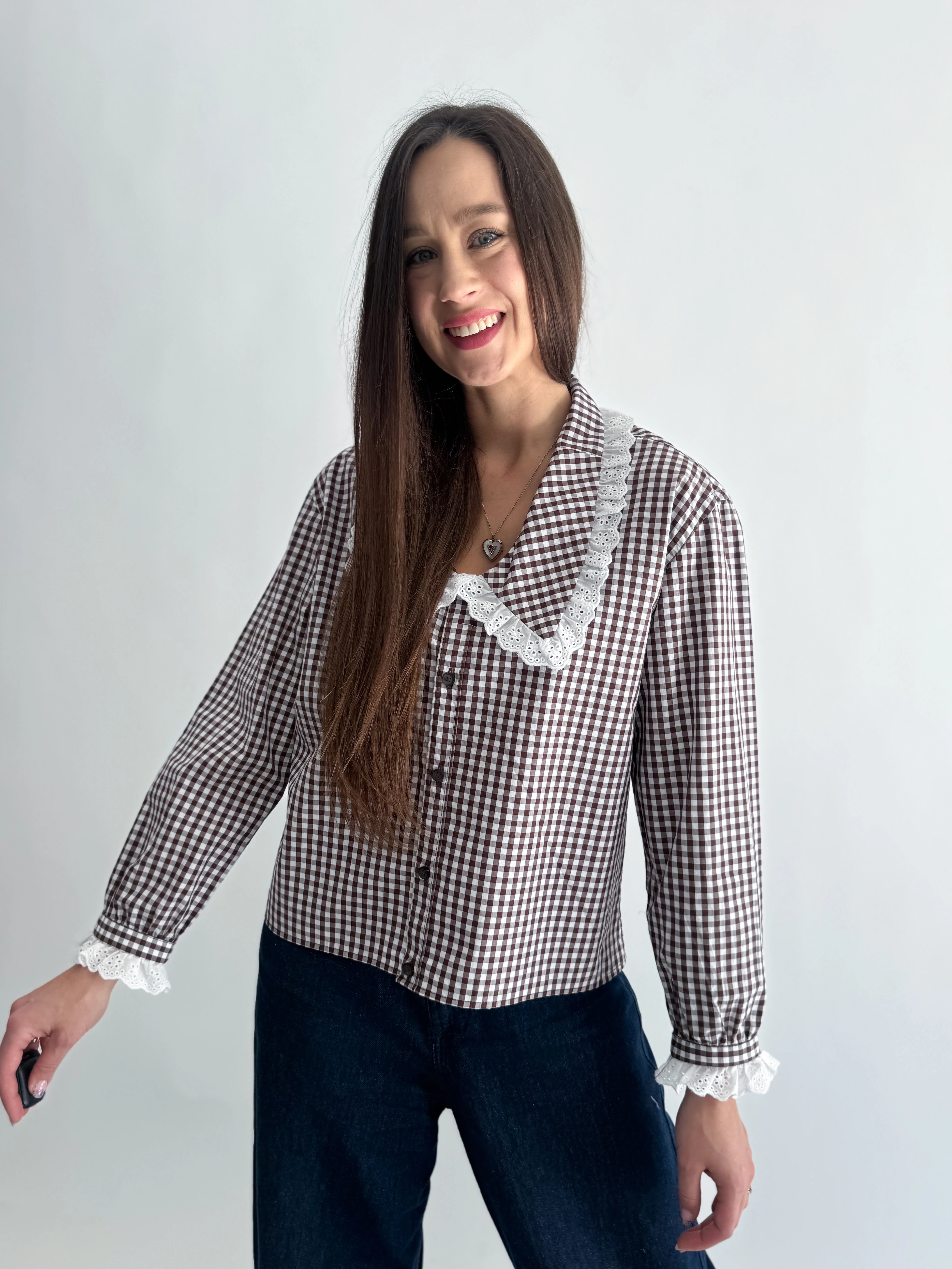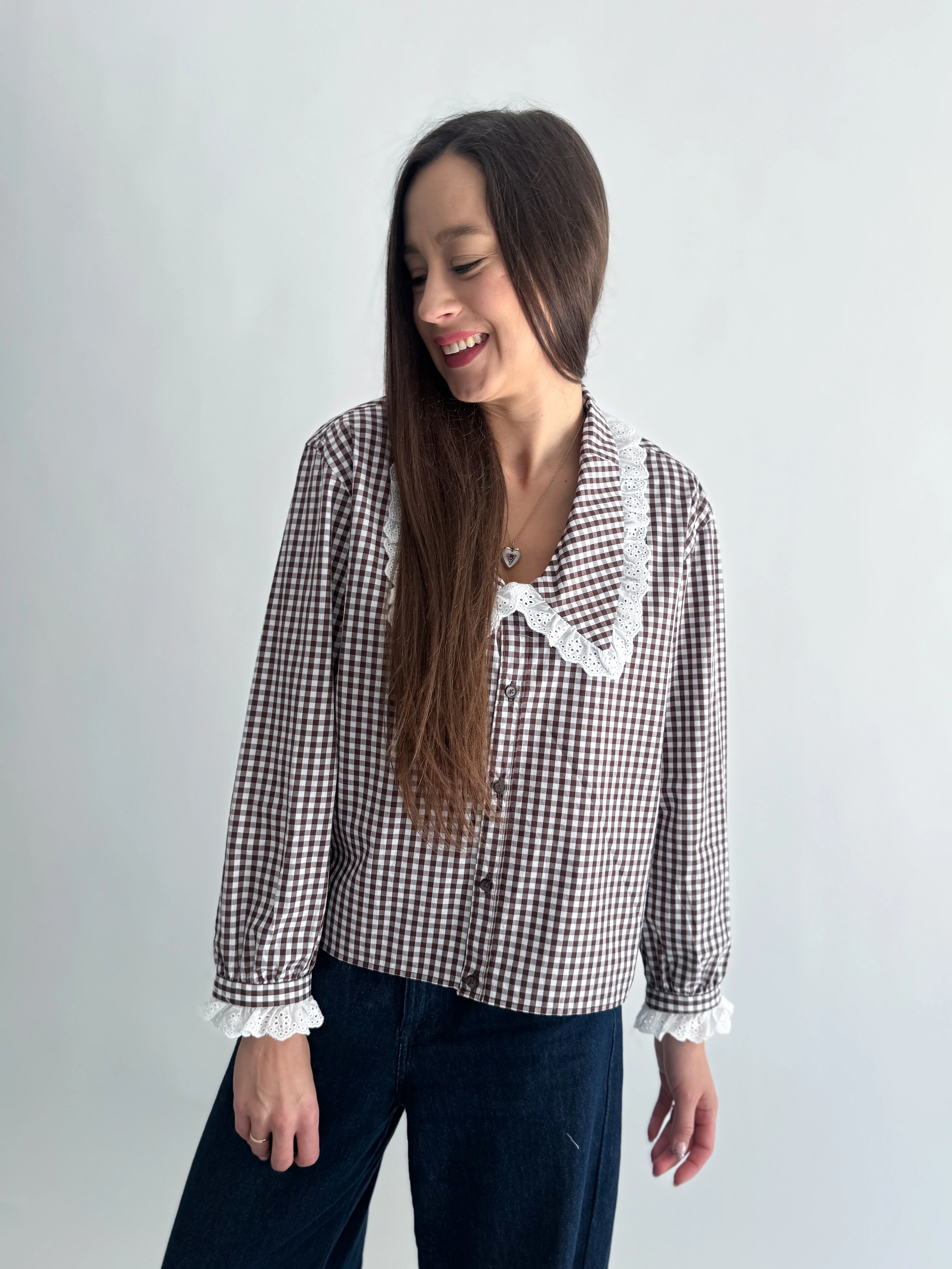 Bawełniana, upcyclingowa koszula z kołnierzem, powstała z męskiej koszuli z drugiego obiegu. Koszula zyskała przepiękny duży kołnierz zakończony koronką, która znalazła się również na zakończeniu rękawów. Świetnie wygląda luźno jak i włożona w spodnie/spódnicę.