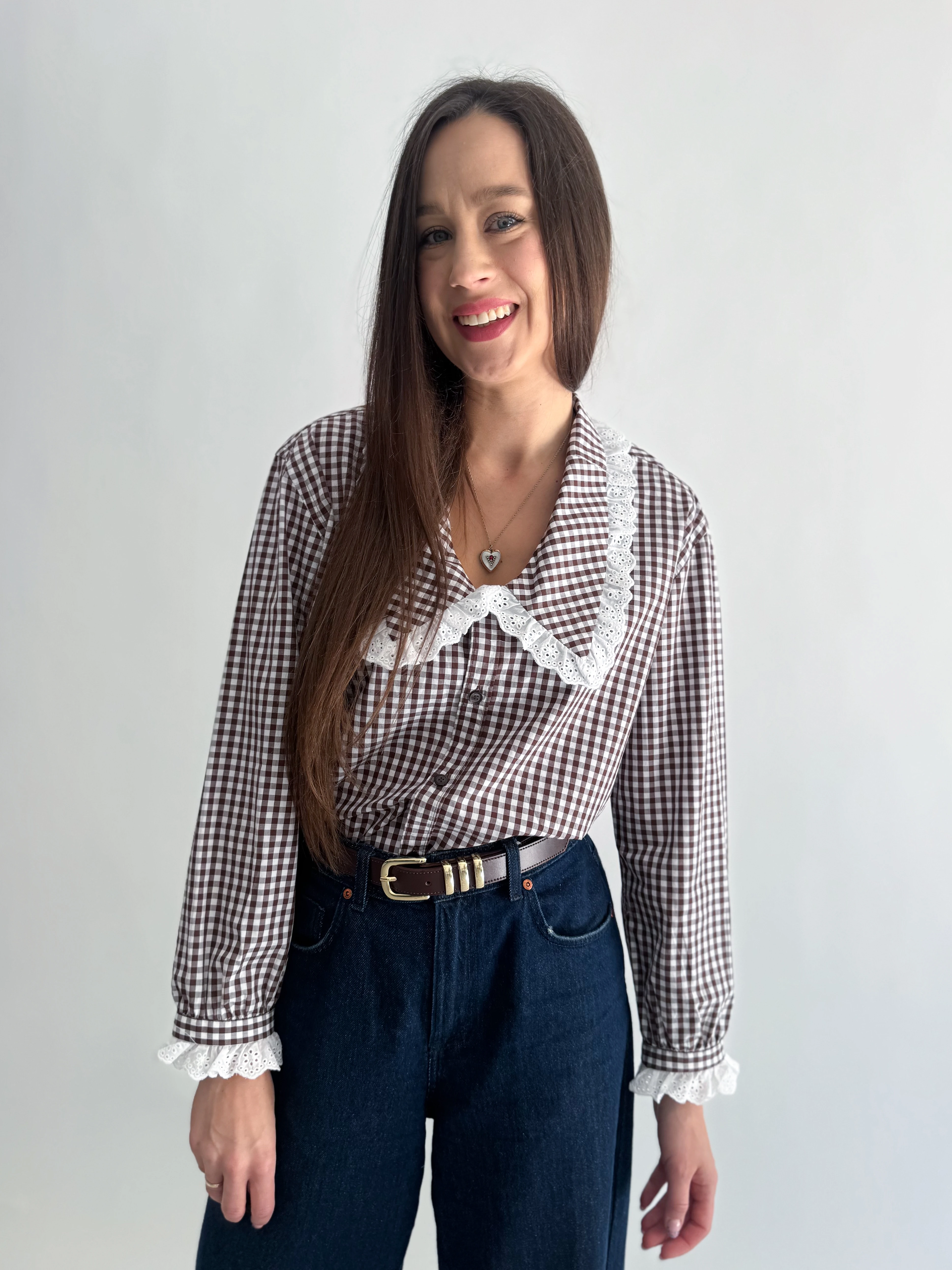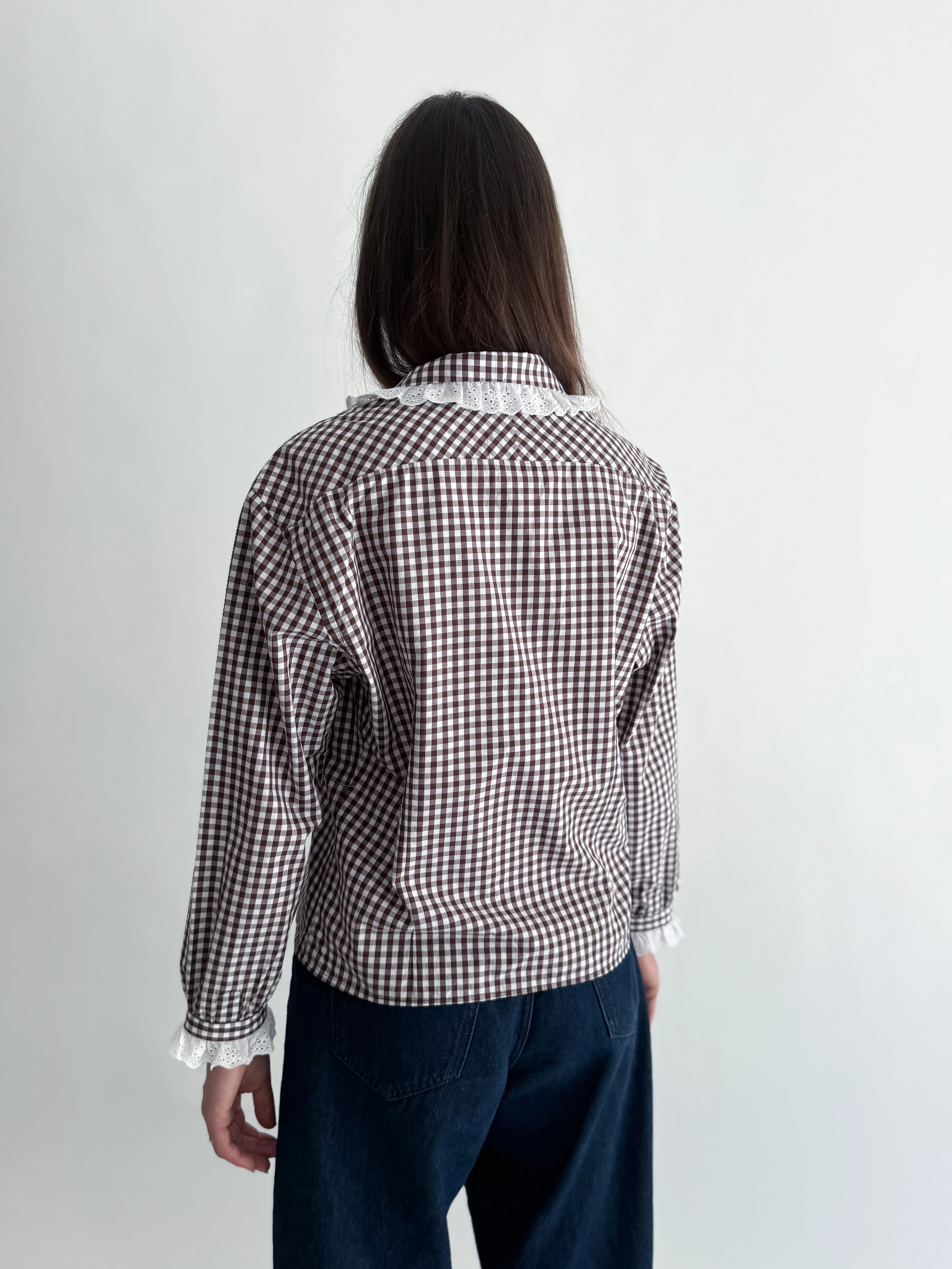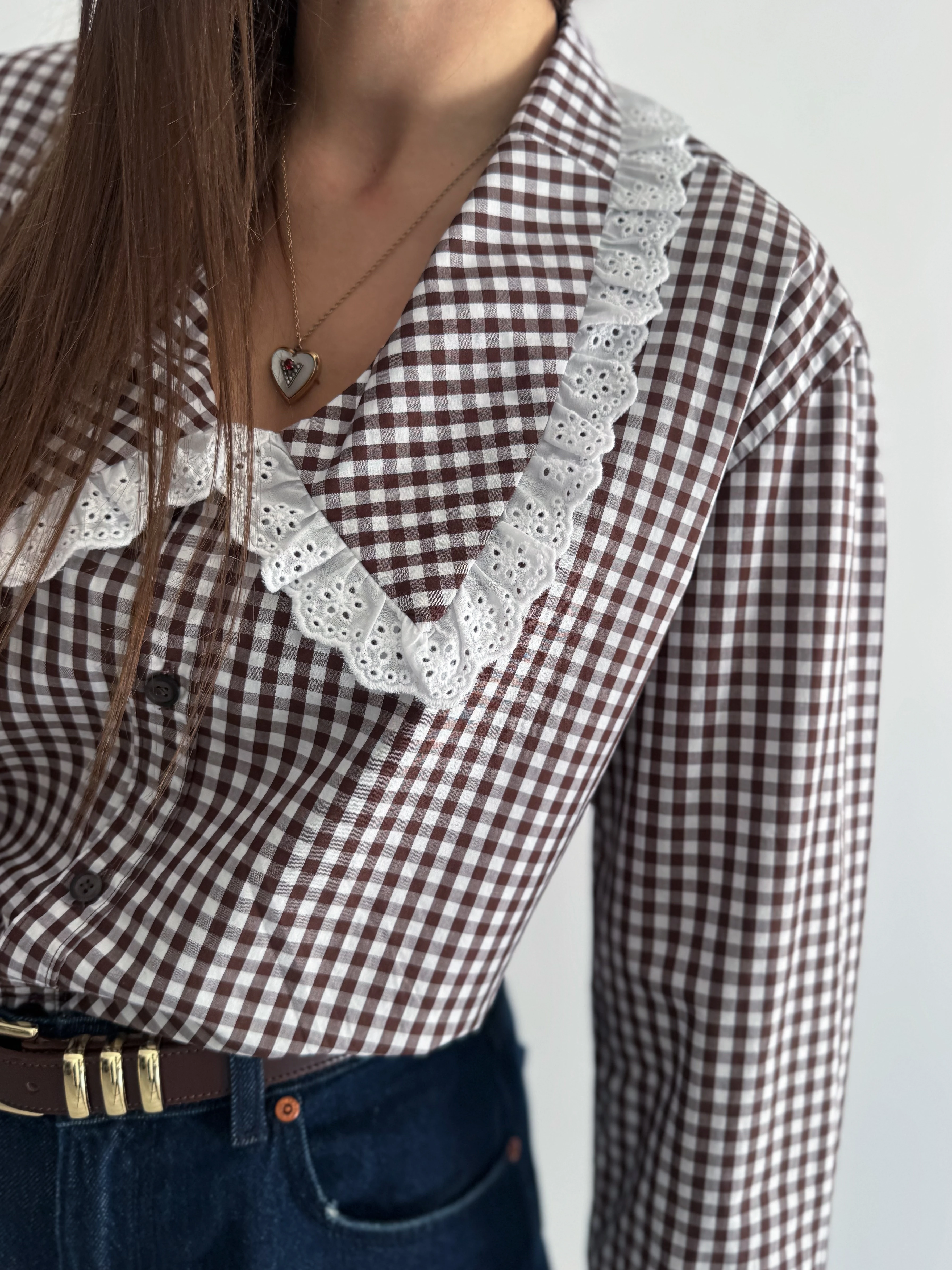Bawełniana, upcyclingowa koszula z kołnierzem, powstała z męskiej koszuli z drugiego obiegu. Koszula zyskała przepiękny duży kołnierz zakończony koronką, która znalazła się również na zakończeniu rękawów. Świetnie wygląda luźno jak i włożona w spodnie/spódnicę.