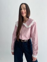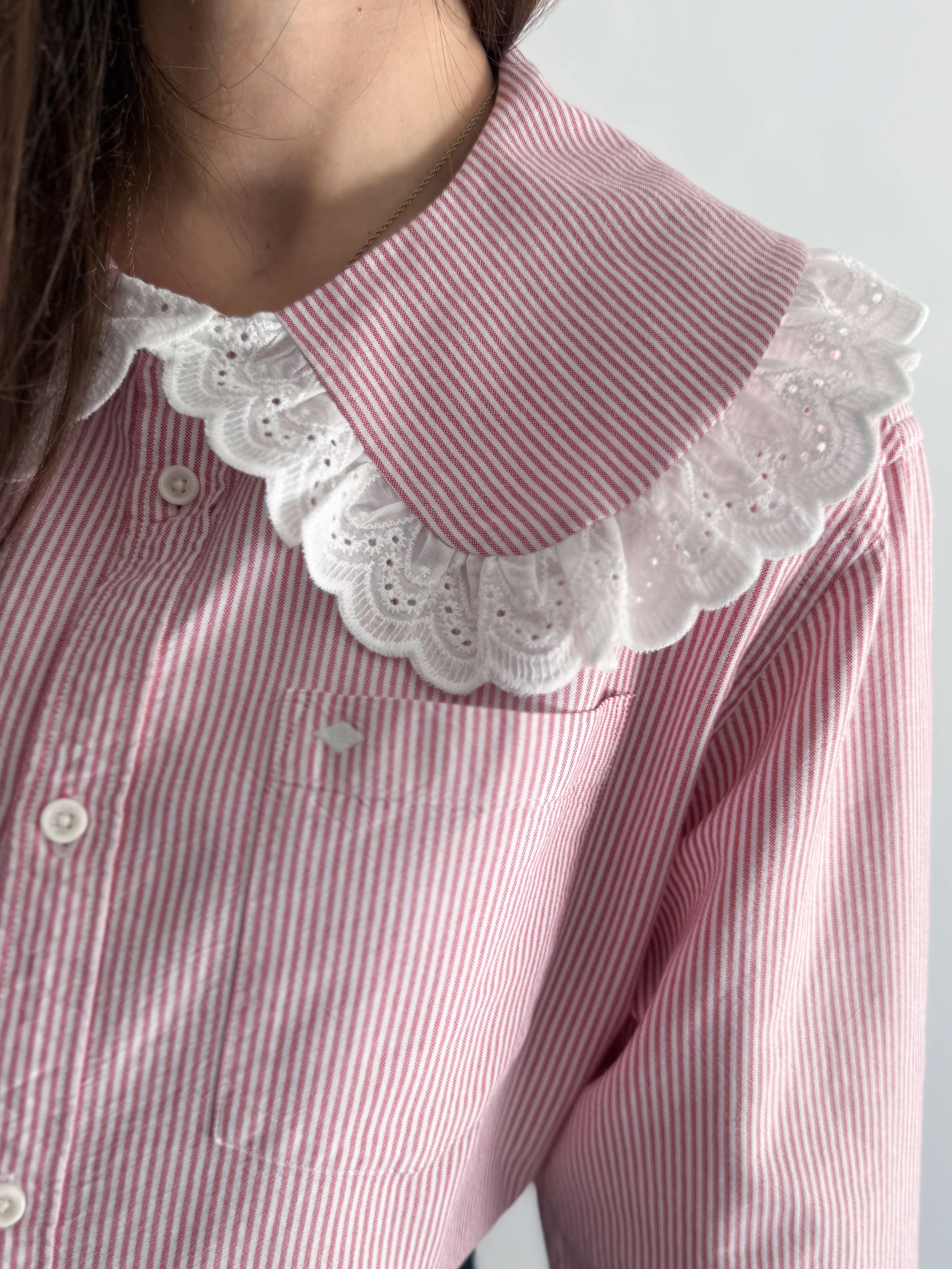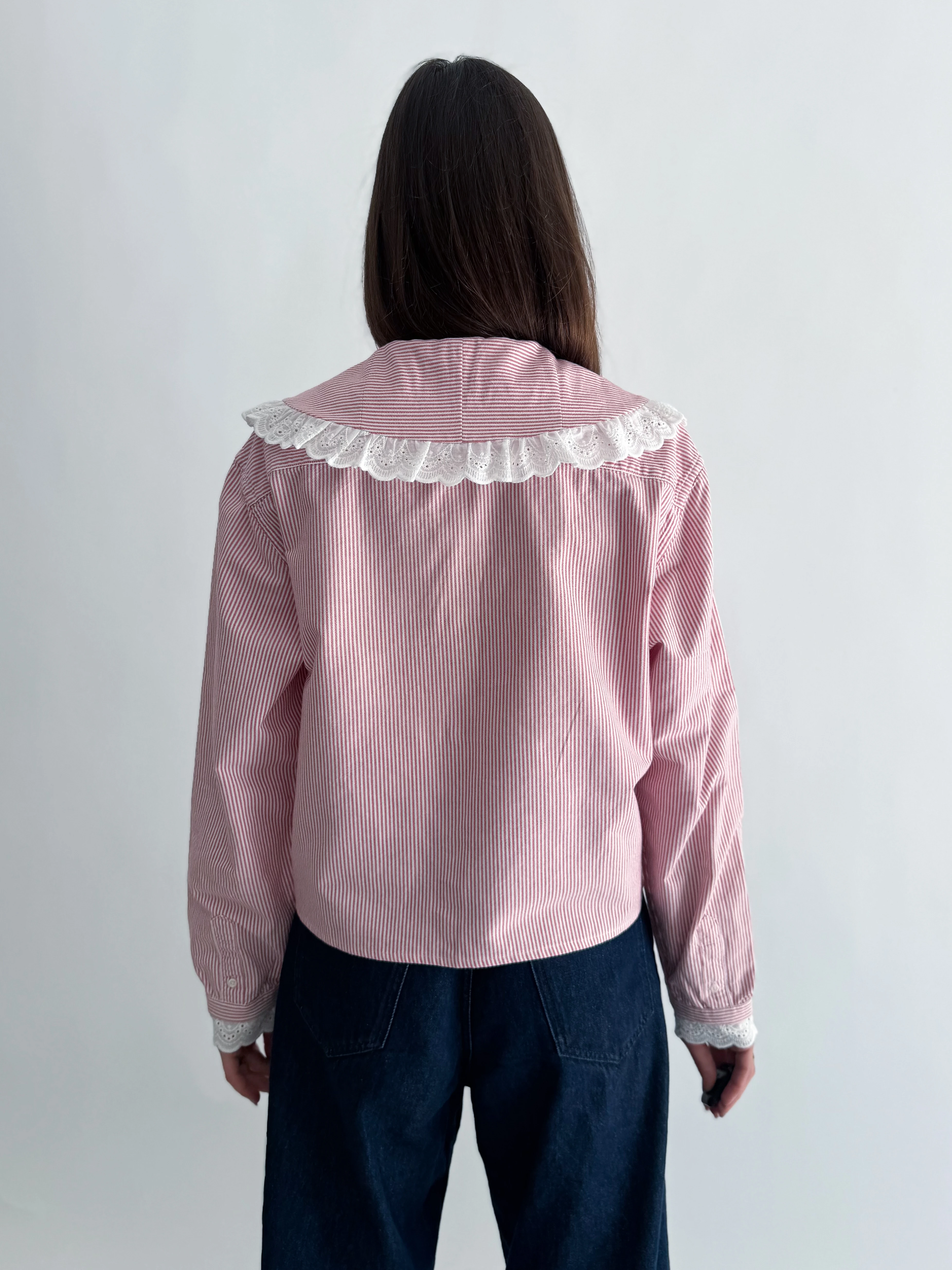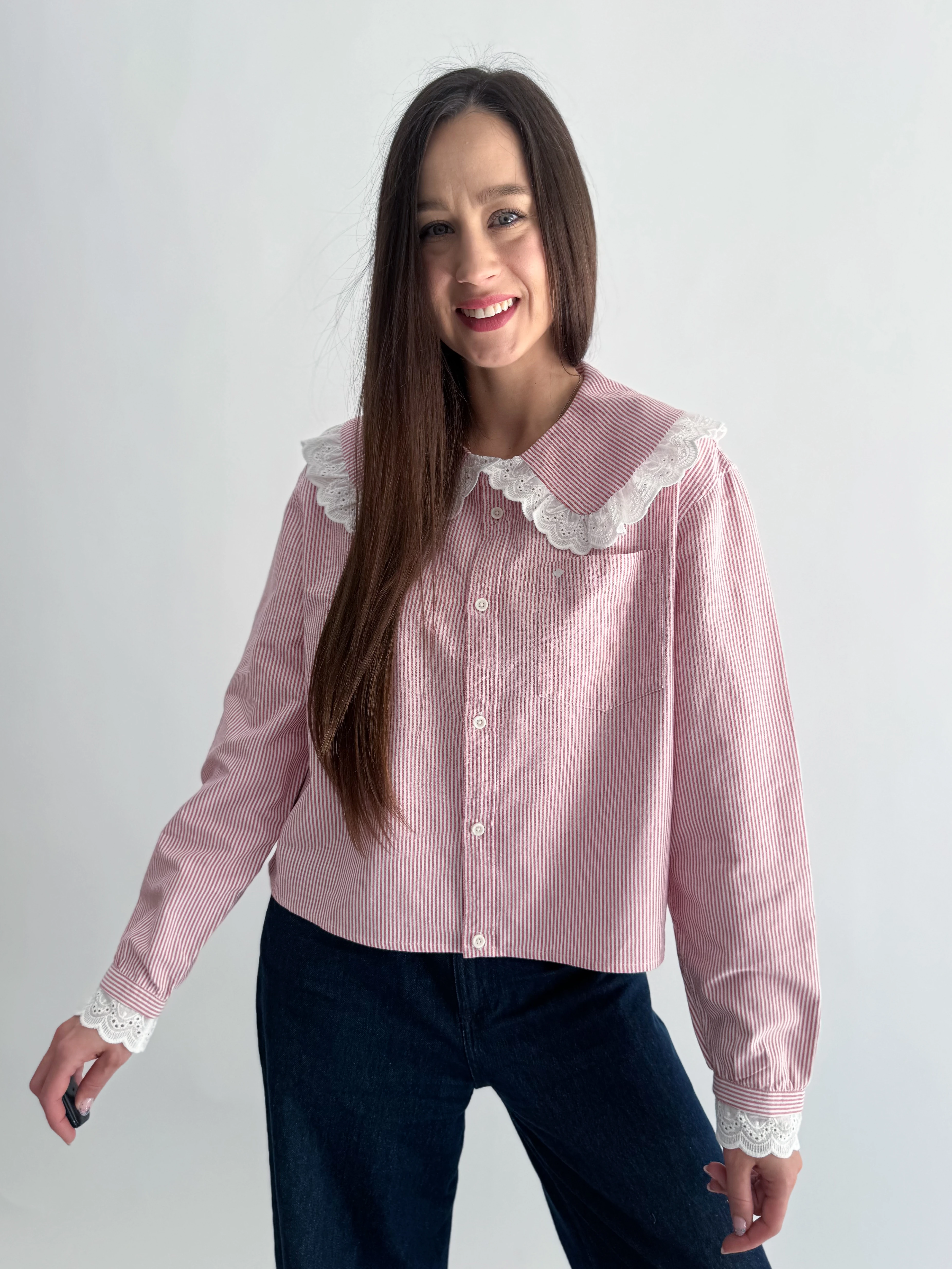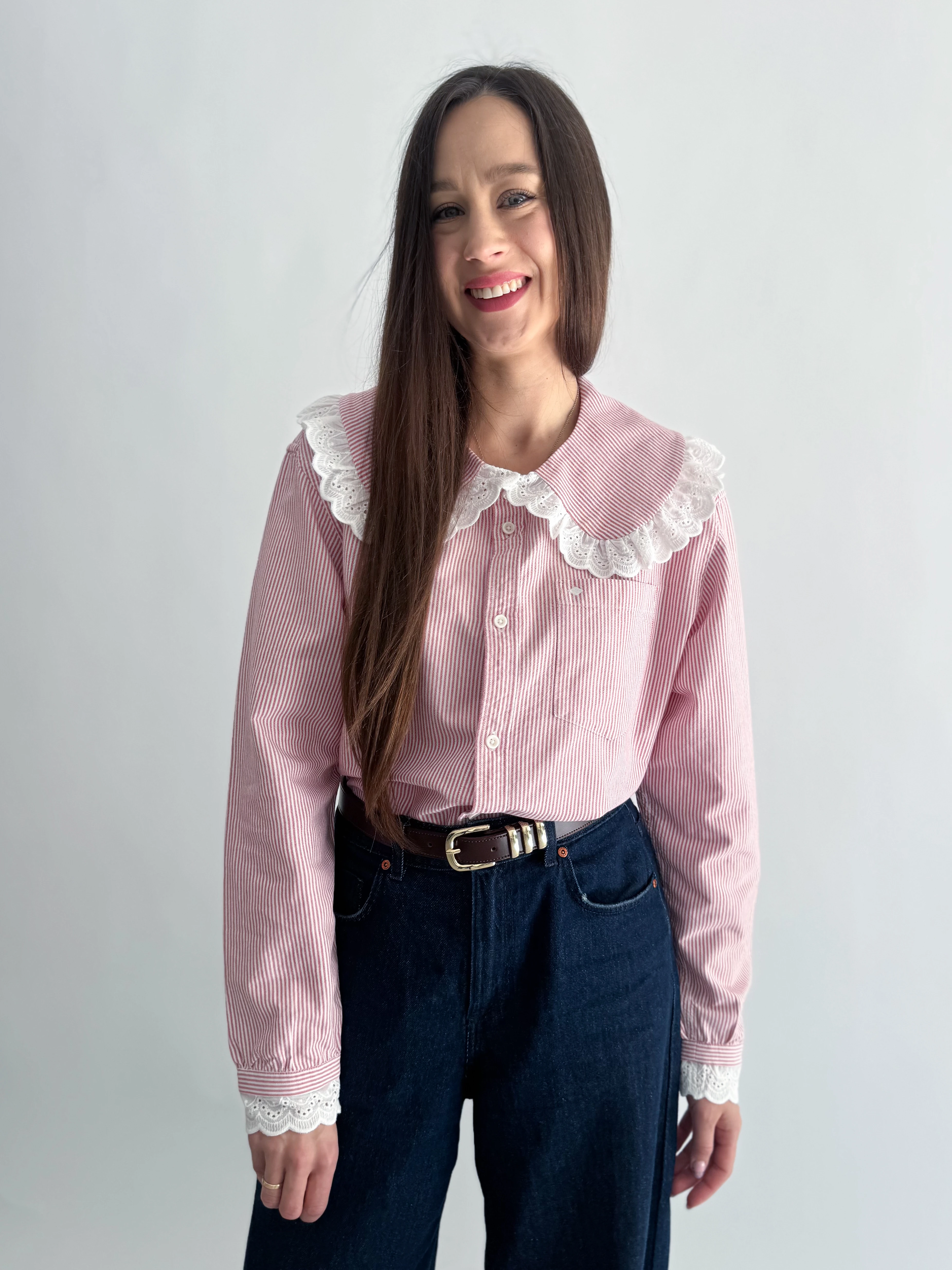 Bawełniana, upcyclingowa koszula z kołnierzem, powstała z męskiej koszuli z drugiego obiegu. Koszula zyskała przepiękny duży kołnierz zakończony koronką, która znalazła się również na zakończeniu rękawów. Świetnie wygląda luźno jak i włożona w spodnie/spódnicę.