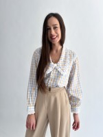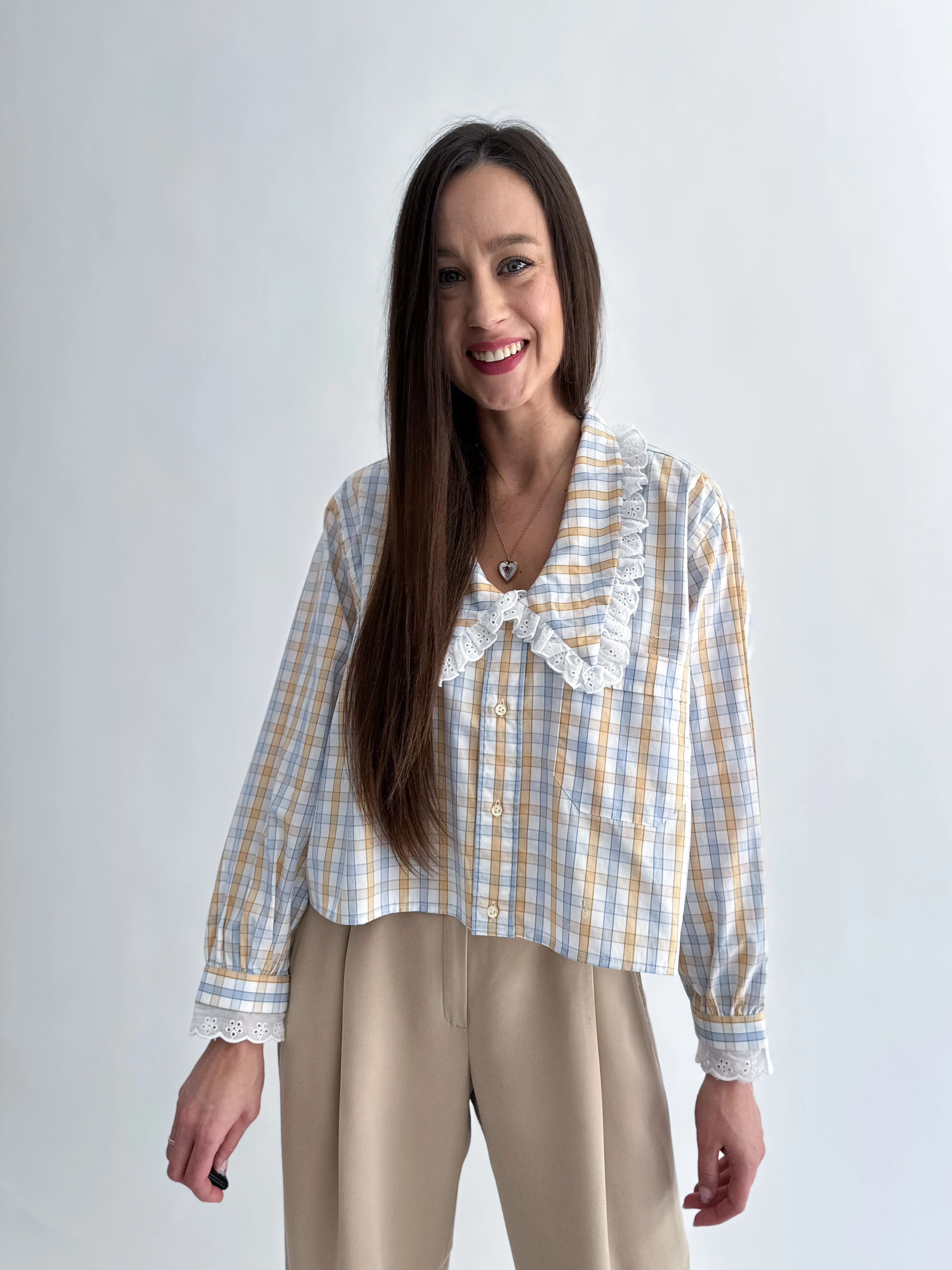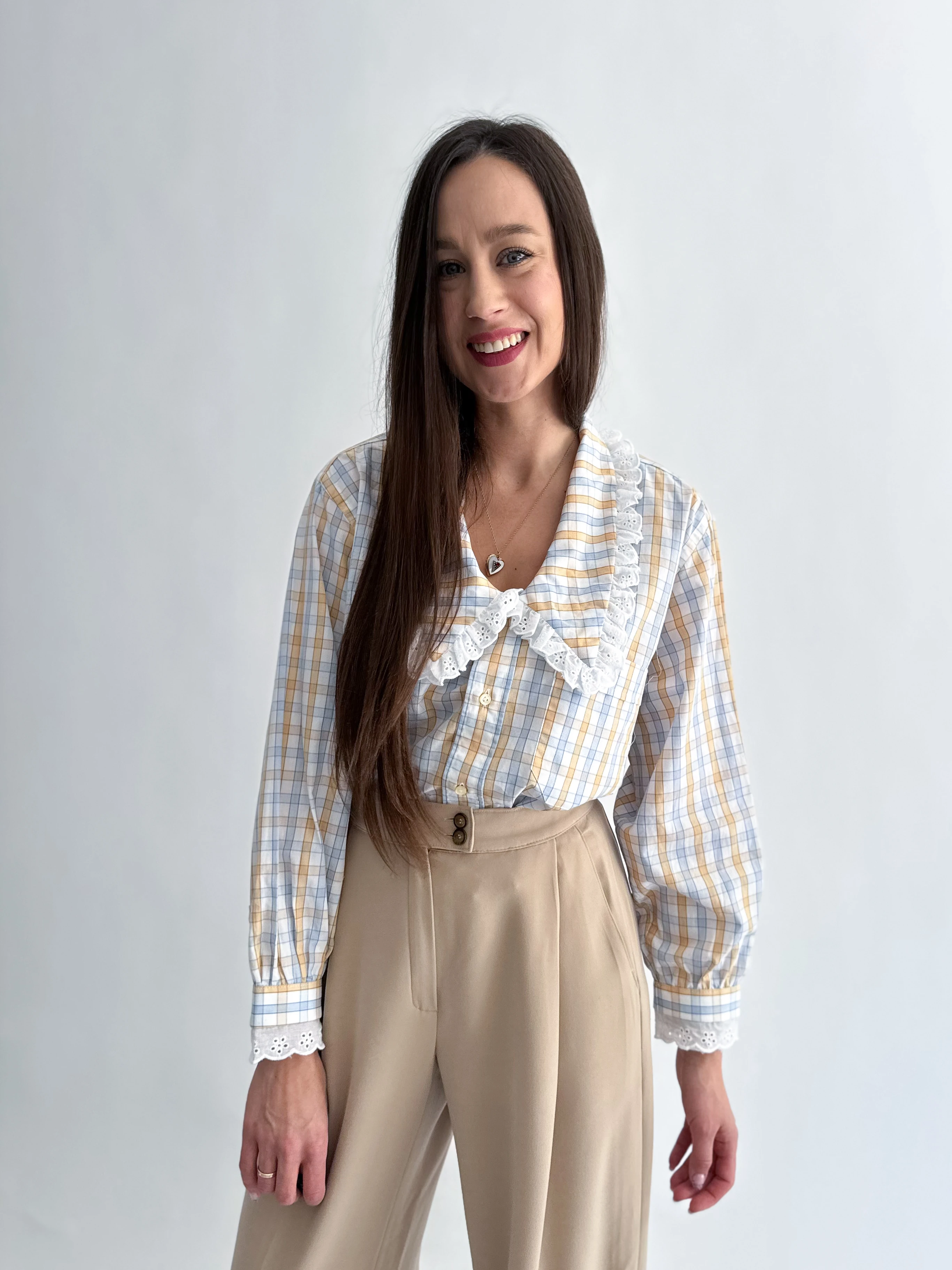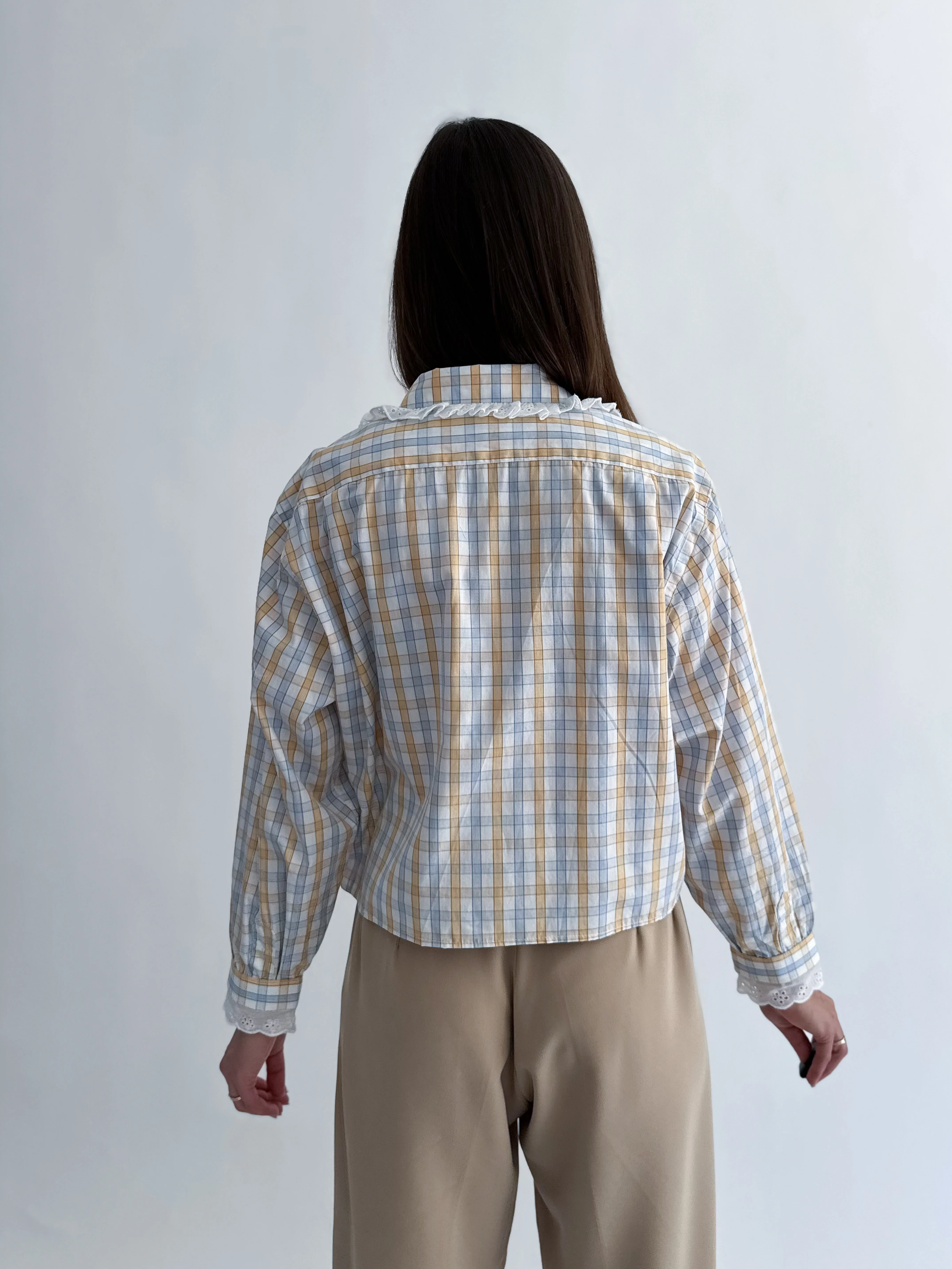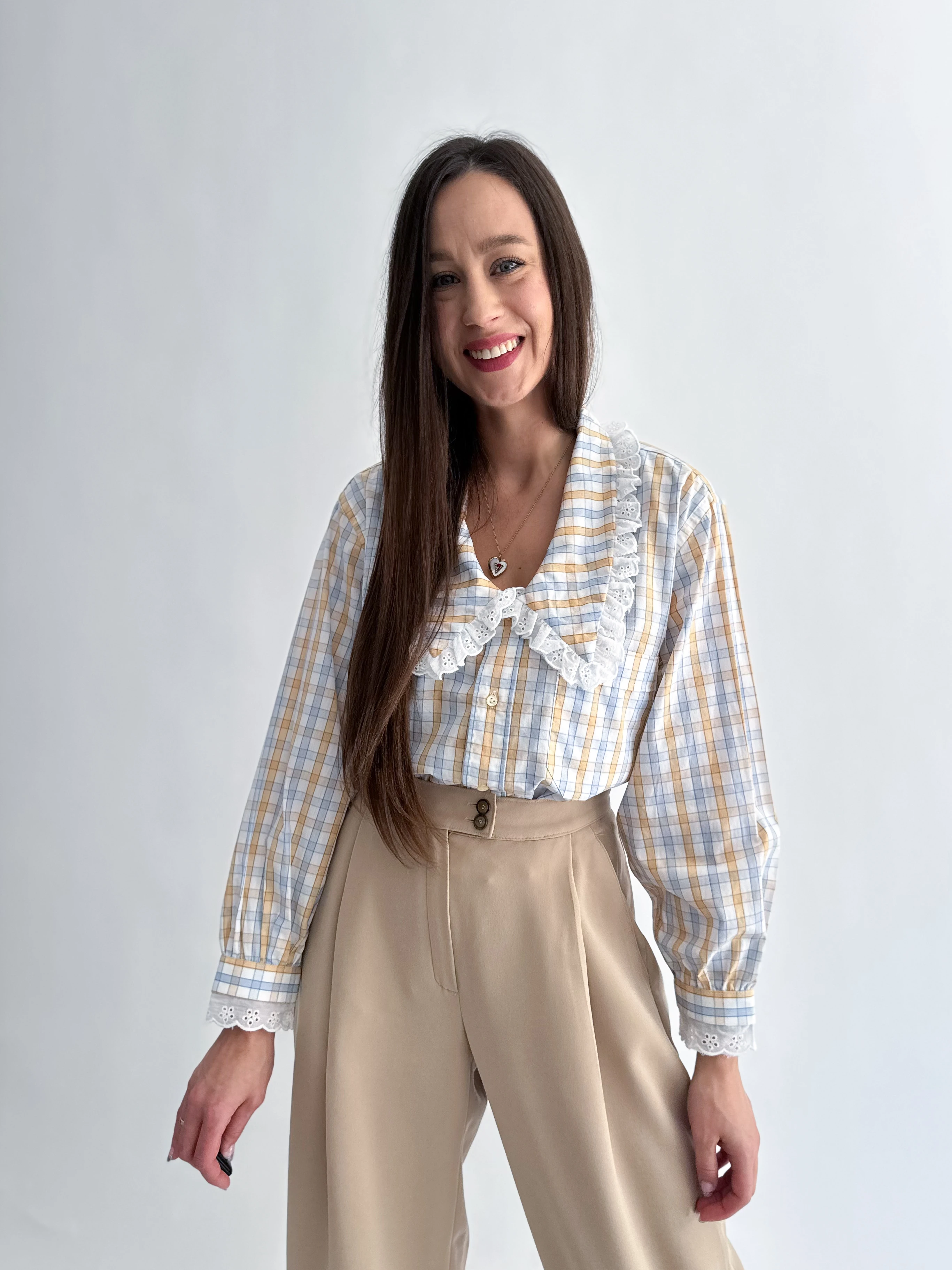 Bawełniana, upcyclingowa koszula z kołnierzem, powstała z męskiej koszuli z drugiego obiegu. Koszula zyskała przepiękny duży kołnierz zakończony koronką, która znalazła się również na zakończeniu rękawów. Świetnie wygląda luźno jak i włożona w spodnie/spódnicę.