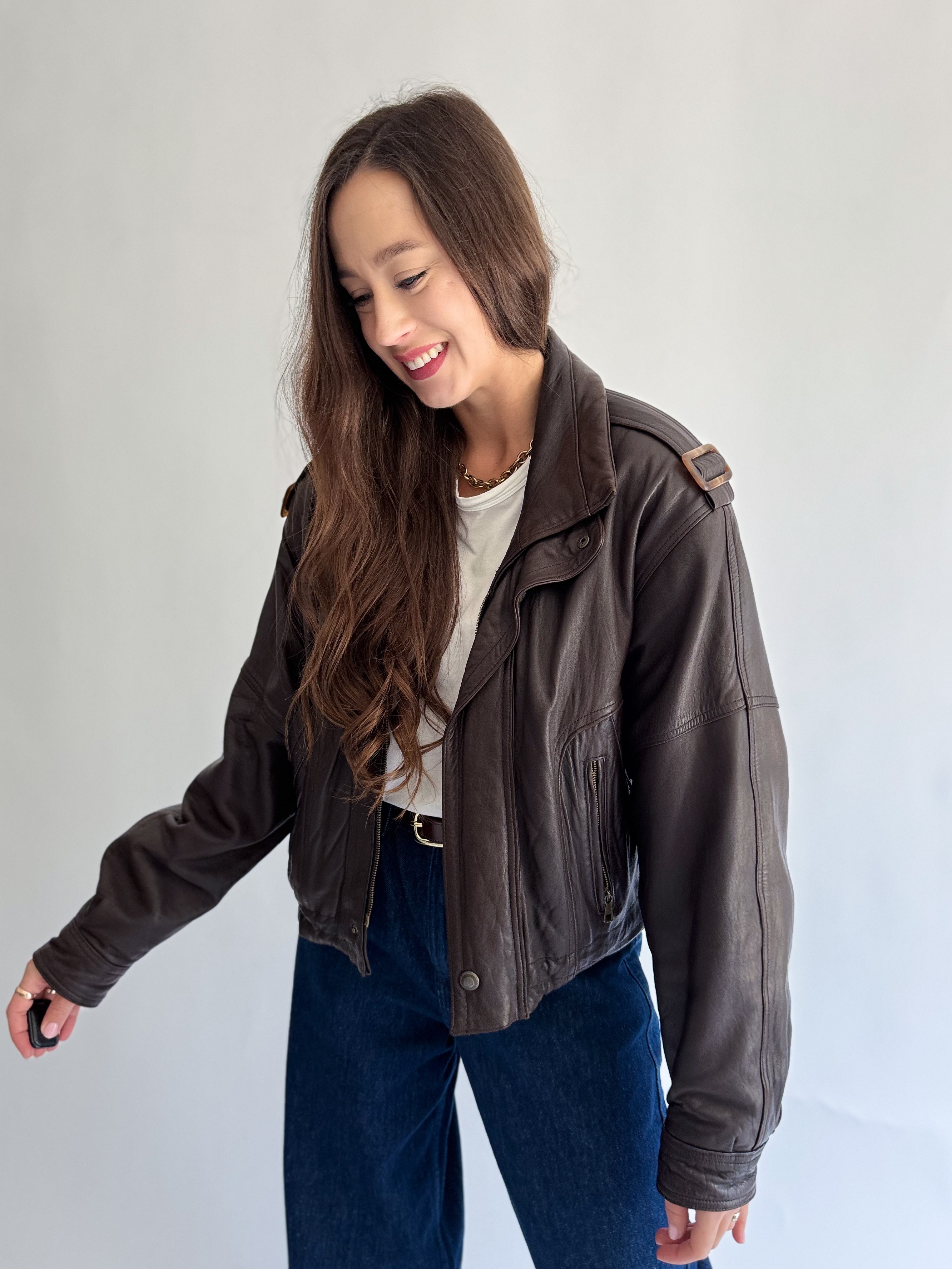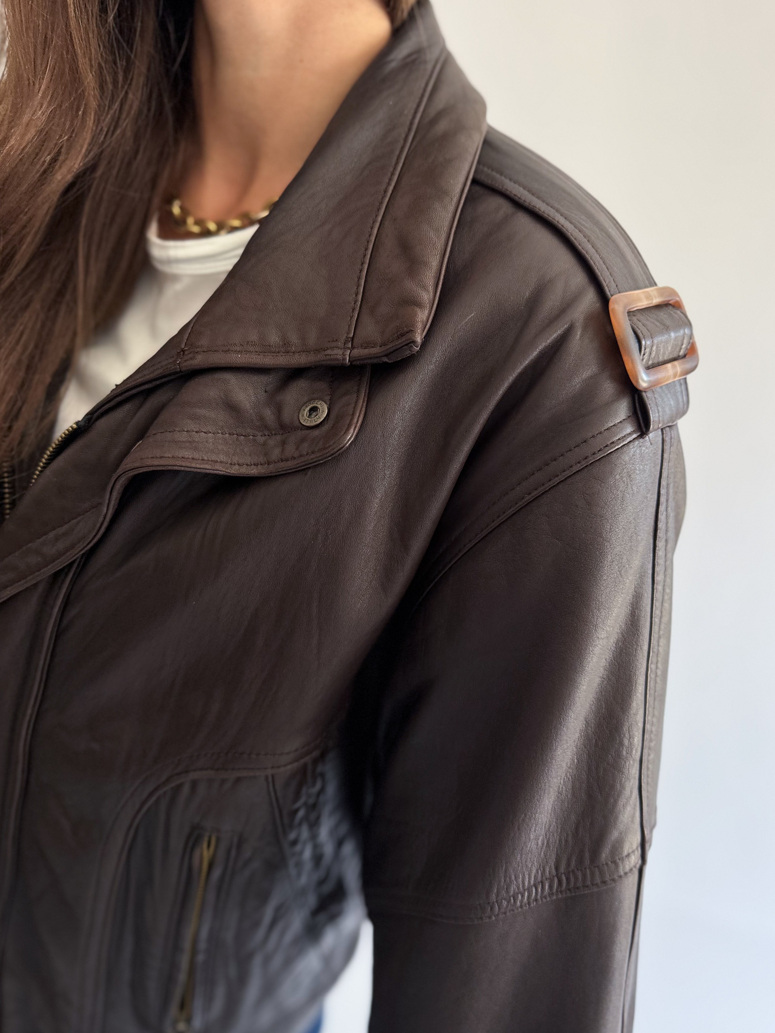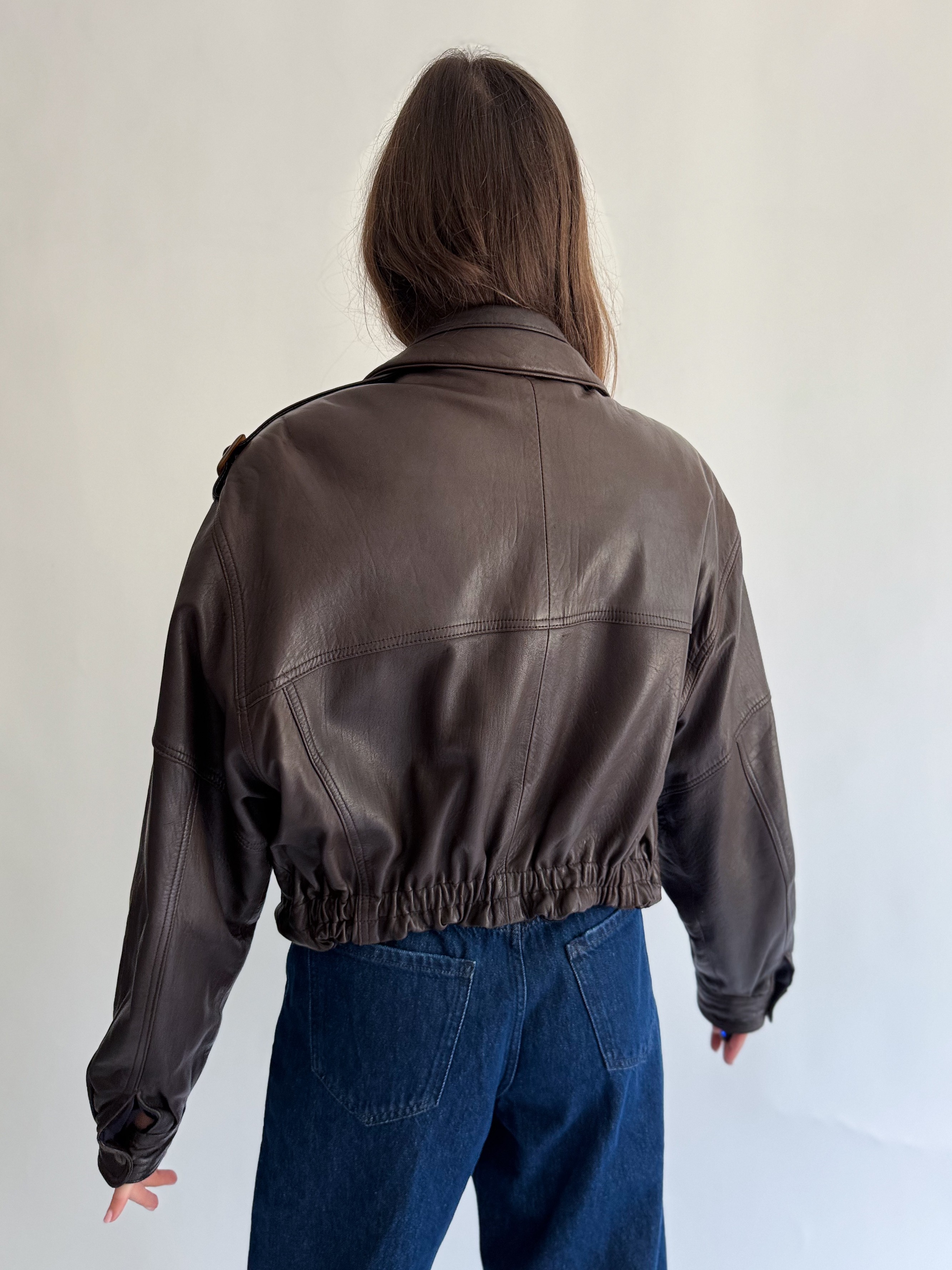 Skórzana, ciemno brązowa kurtka powstała z innej, skórzanej kurtki vintage.