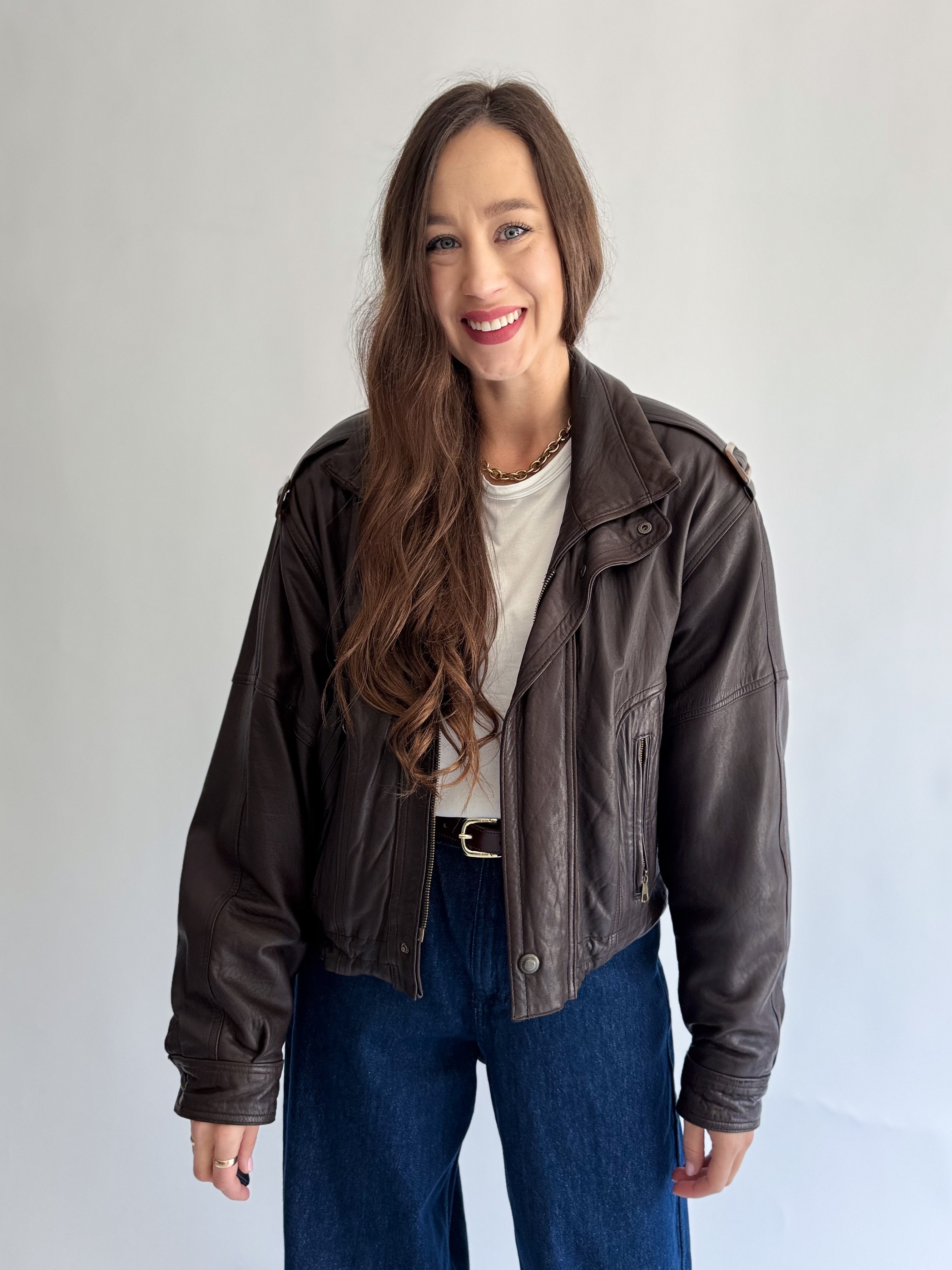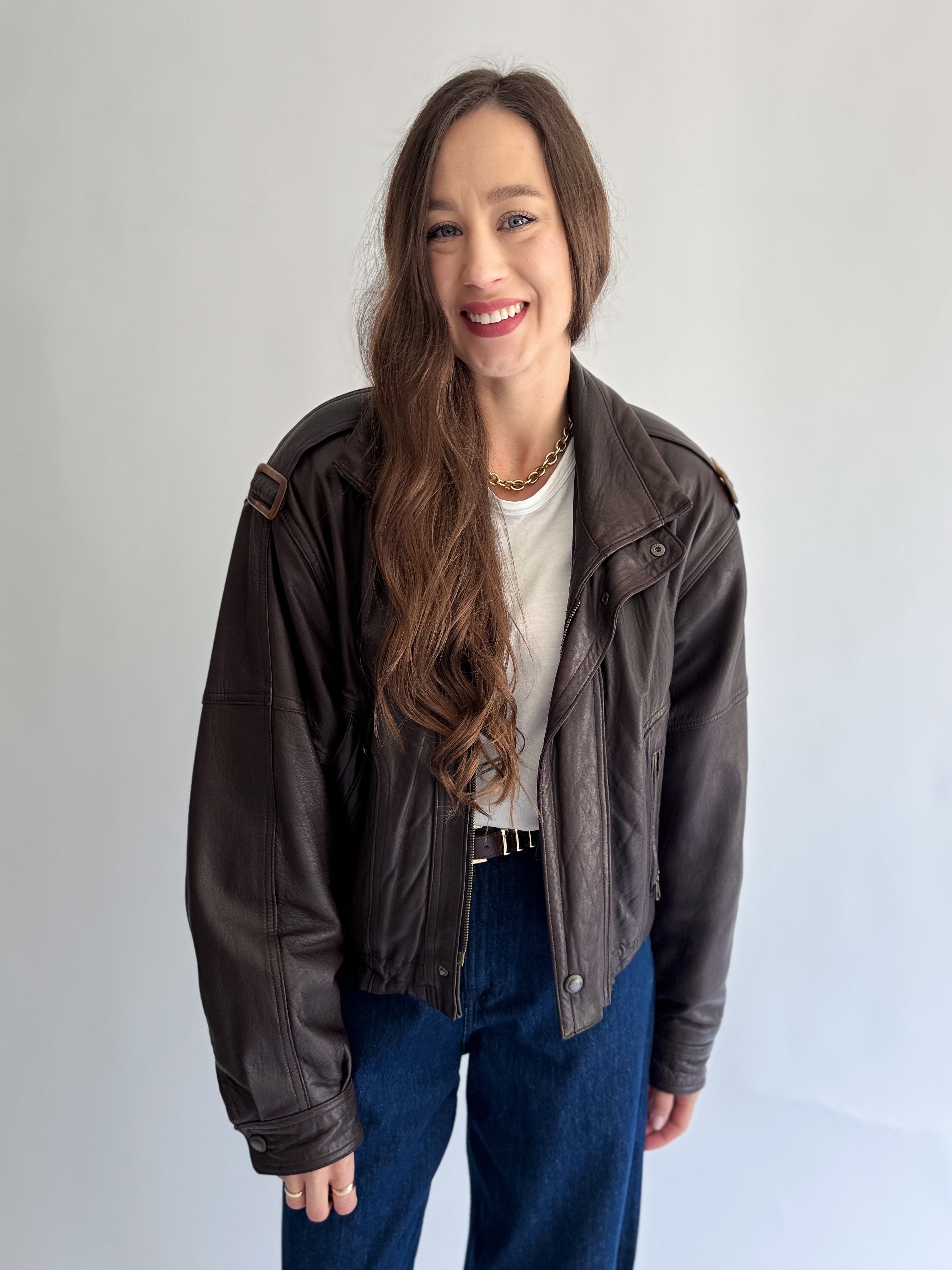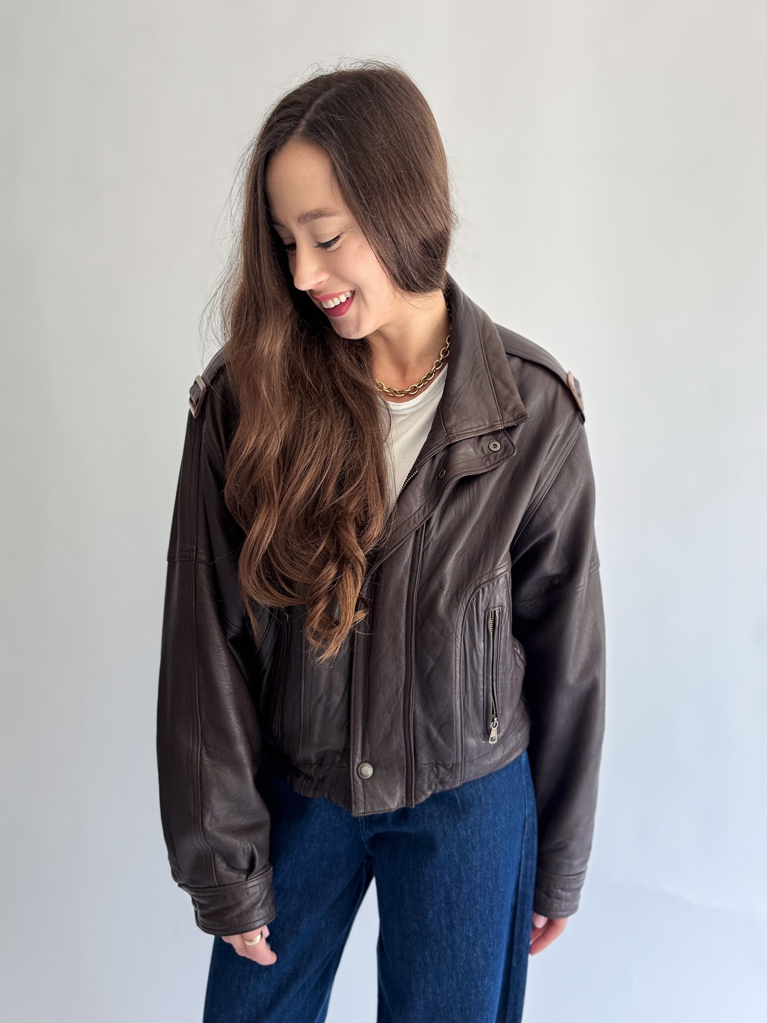 Skórzana, ciemno brązowa kurtka powstała z innej, skórzanej kurtki vintage.